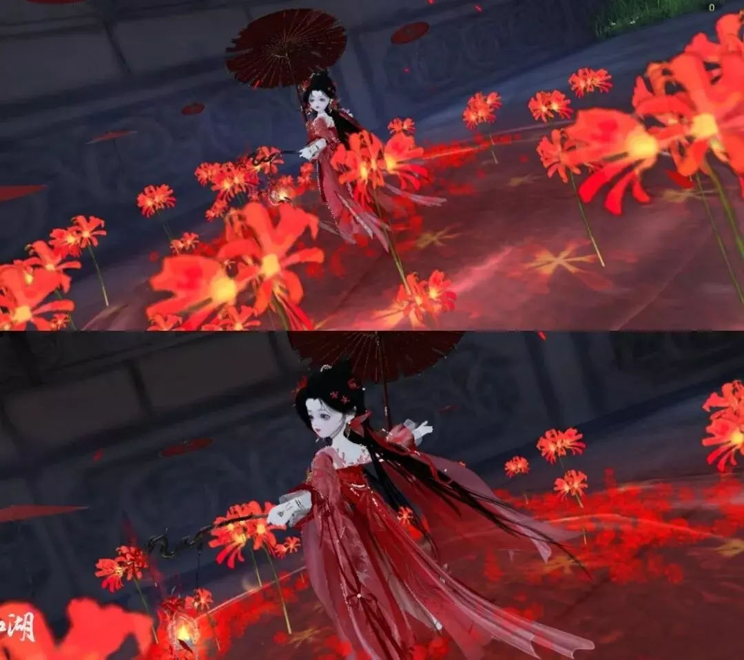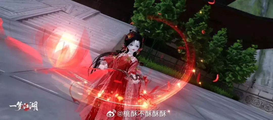 纸伞是移动的屋檐,是身边之人为自己撑起的一小片天地。少侠复刻了宣传图中的画面。时装·情诉幽魂红衣与腰挂·照骨观身动作相呼应,我们更从少侠的美丽回眸,瞥见“深情可堪,至死不渝”的深刻旨趣。