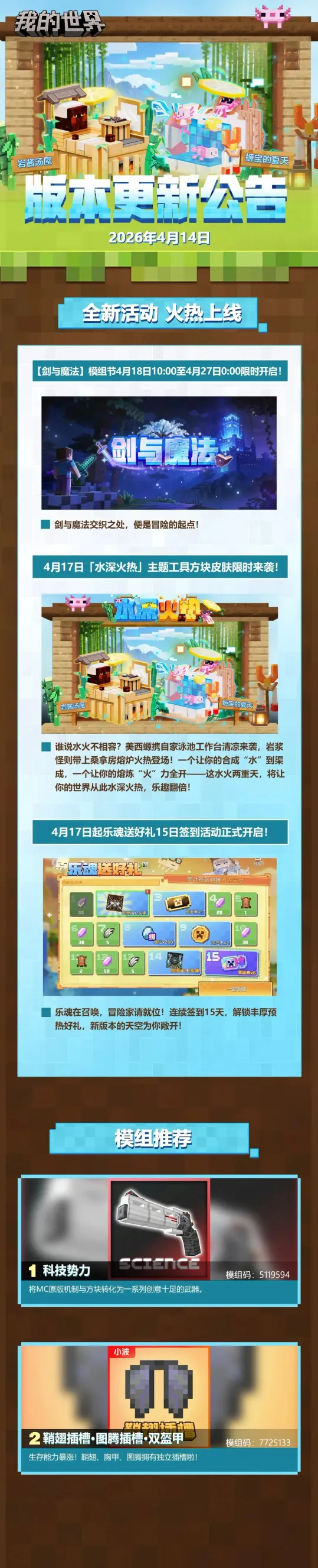 《我的世界》2026年4月14日发布版本更新公告,4月18日-4月27日限时开启【剑与魔法】模组节,4月17日上线「水深火热」主题工具方块皮肤,同日起还有乐魂送好礼15日签到活动,另有两款实用模组推荐。