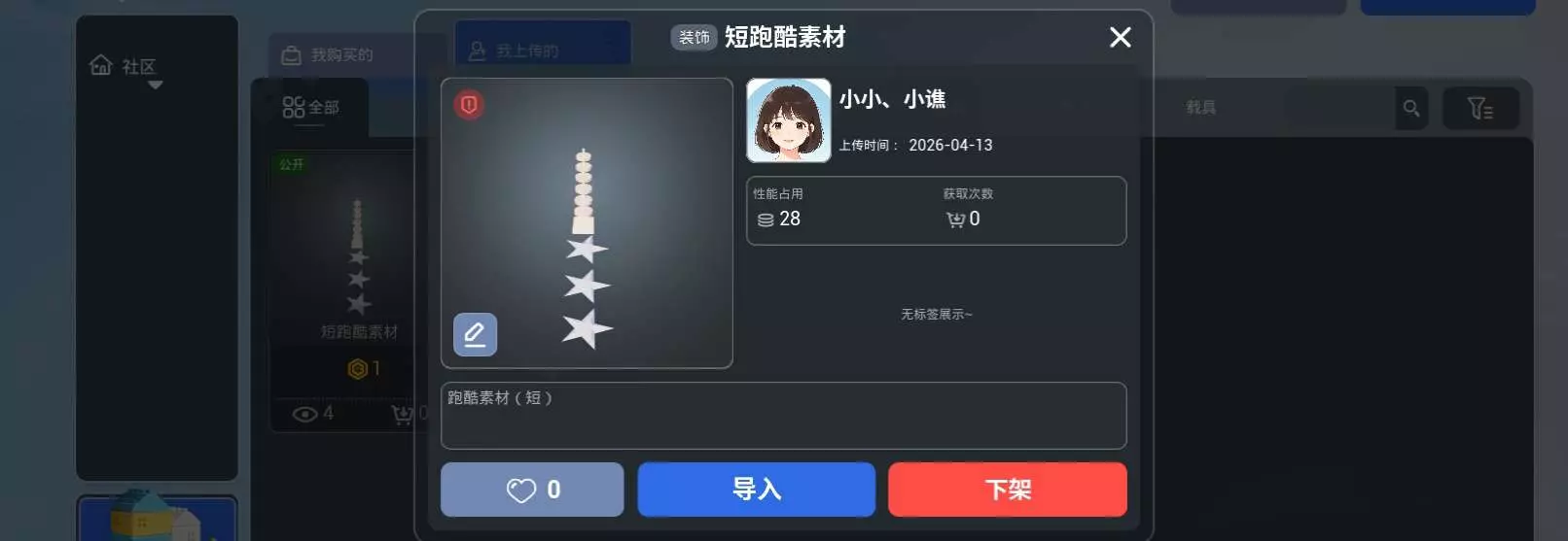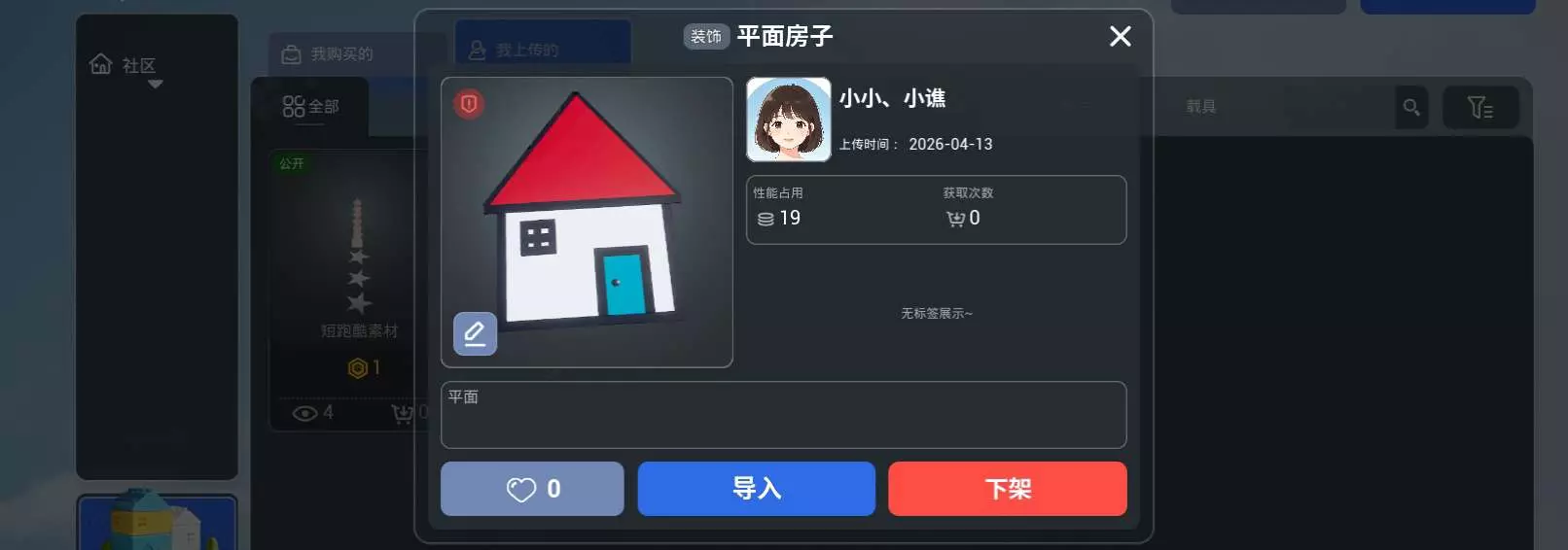 用户在造物岛社区分享了两款自制装饰模组,分别是短跑酷素材和平面房子,均由用户“小小、小谯”于2026-04-13上传,性能占用分别为28和19,目前获取次数均为0,用户可选择导入使用。