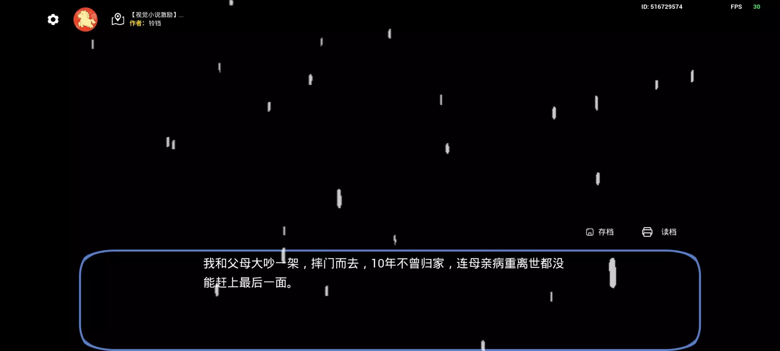 这是参与造物岛社区共建的一篇分享,分享者夸赞铃铛创作的视觉小说作品很不错,展示的内容是主角与父母争吵后离家十年未归,没能见到母亲最后一面的剧情。