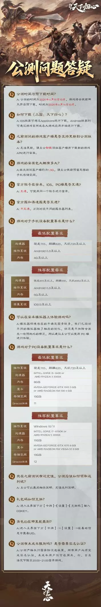 为了让主公们更好地备战公测,飞弟特来呈报公测常见问题解答、公测保障约定等相关资讯,敬请主公查阅。