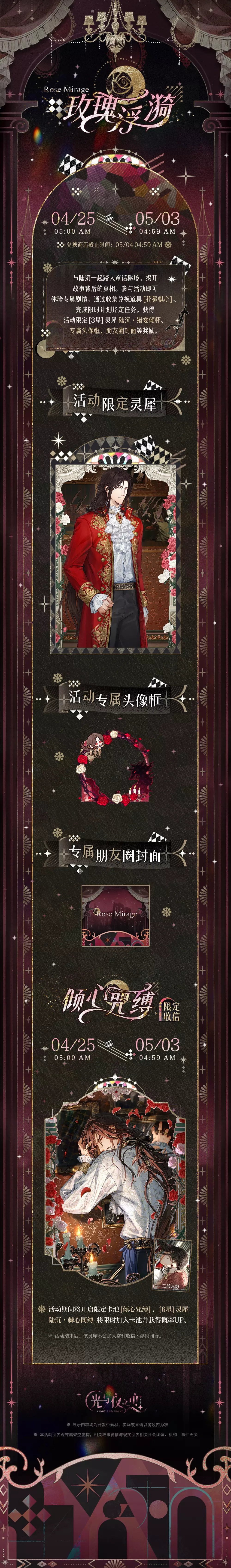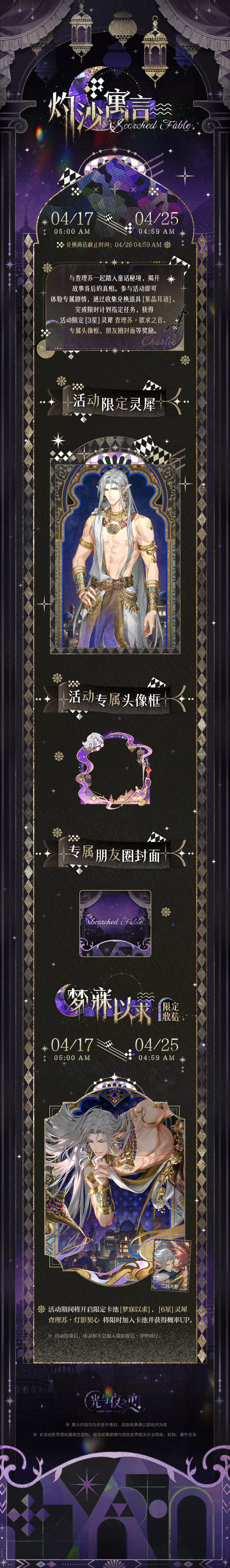 活动说明:与查理苏一起踏入童话秘境,揭开故事背后的真相。参与活动即可体验专属剧情,通过收集兑换道具[紫晶耳语]、完成限时计划指定任务,获得活动限定[3星]灵犀 查理苏・欲求之音、专属头像框、朋友圈封面等奖励。