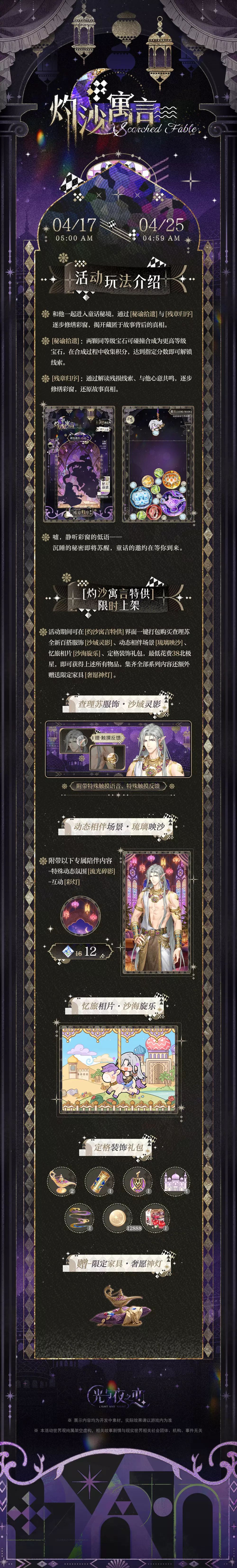 活动期间可在[灼沙寓言特供]界面一键打包购买查理苏全新百搭服饰[沙域灵影]、动态相伴场景[琉璃映沙]、忆旅相片[沙海旋乐]、定格装饰礼包,最低花费38北极星,即可获得上述所有物品。集齐全部系列内容还额外赠送限定家具[奢愿神灯]。