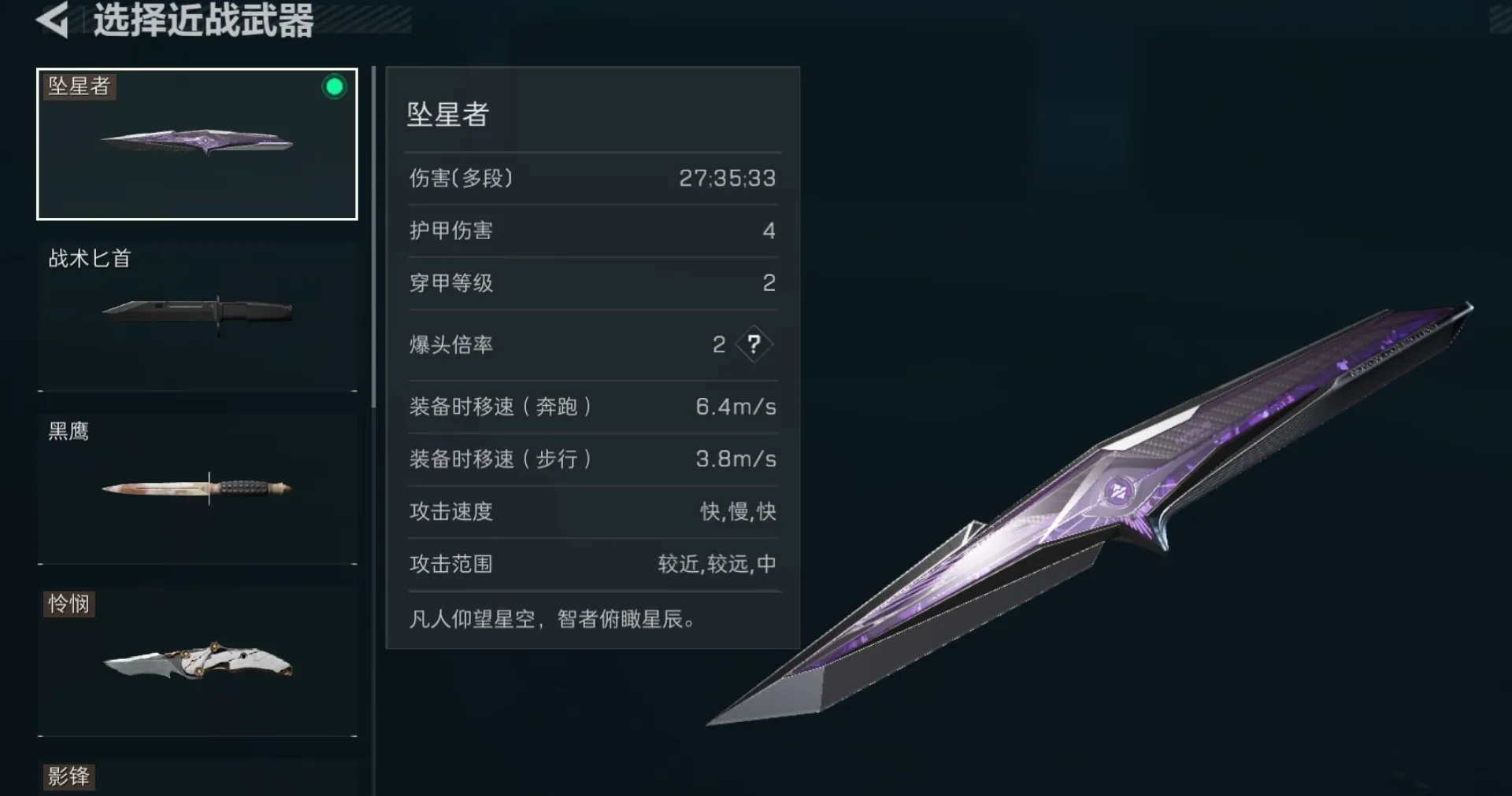 全新传说近战武器【坠星者】,由哈夫克利用来自未知深空的坠星,打造成锋利无比的短刃。清脆利落的挥刀手感时刻展示着它的锐利锋芒!