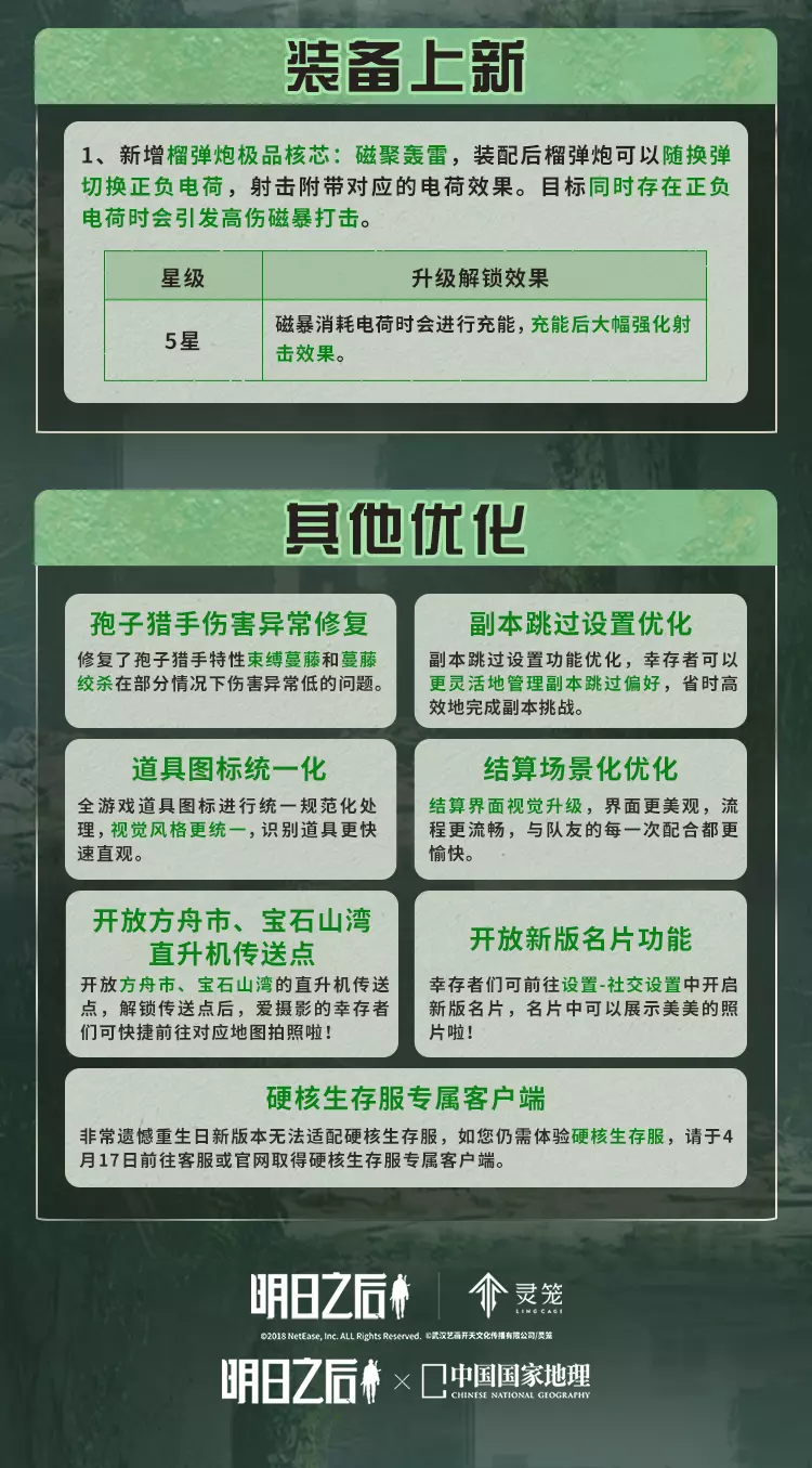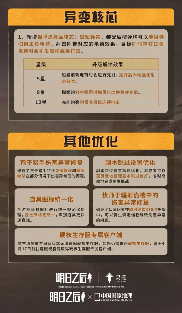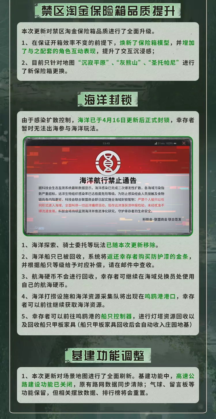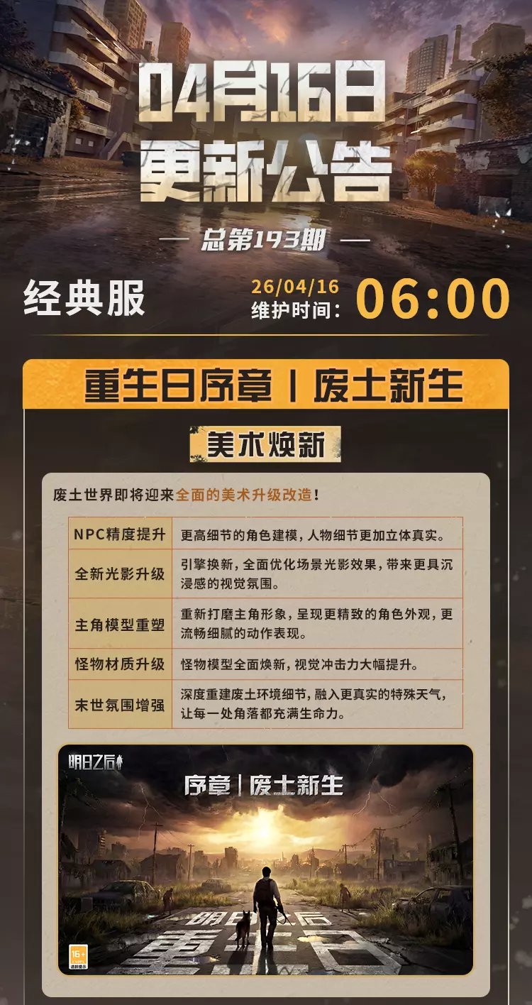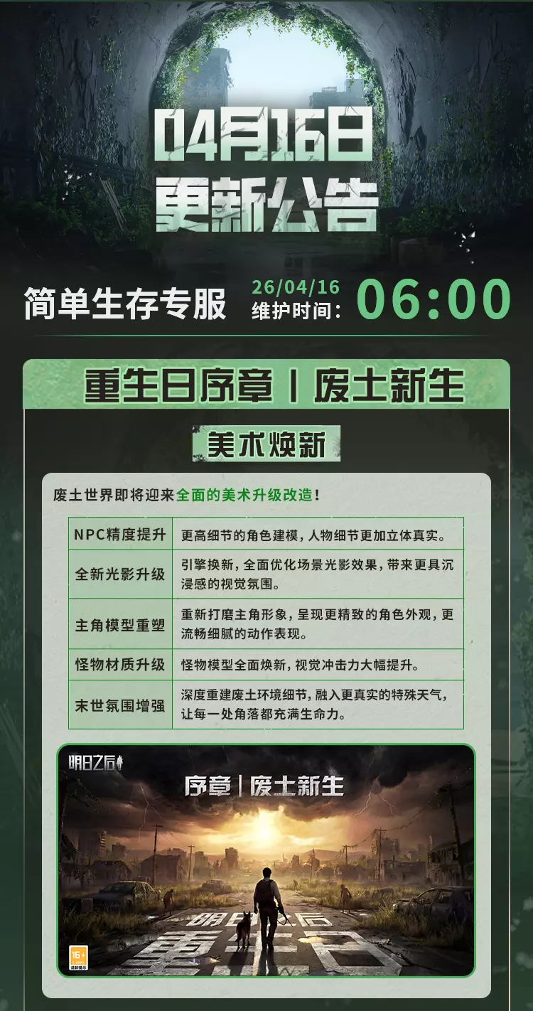 明日之后4月16日将对经典服、简单生存专服开启版本更新维护,本次更新带来废土焕新,完成美术、界面、采集、捏脸等多方面升级,开启灵笼联动活动可免费领限定动作,同时开启春季通行证、辐射诡楼新赛季,上线新异变核芯与多种活动,封锁海洋玩法并调整多项游戏机制。