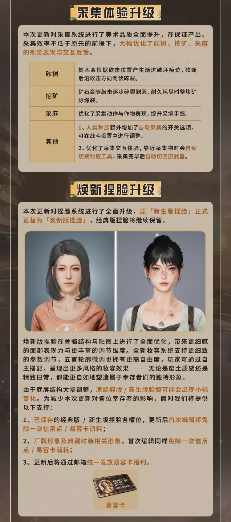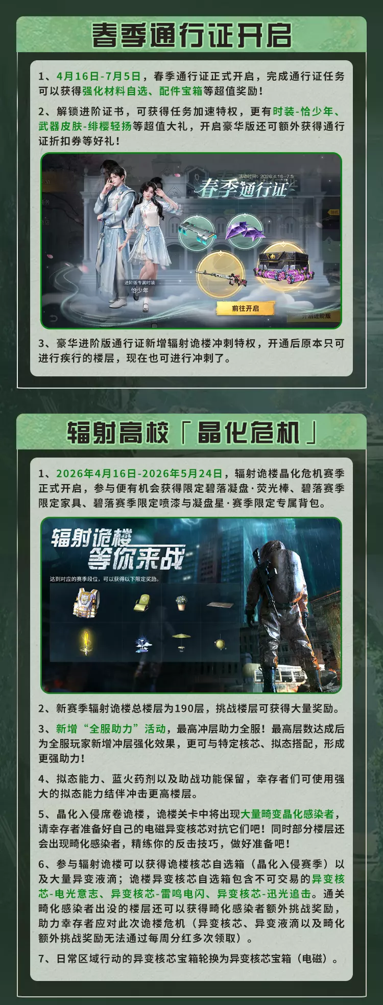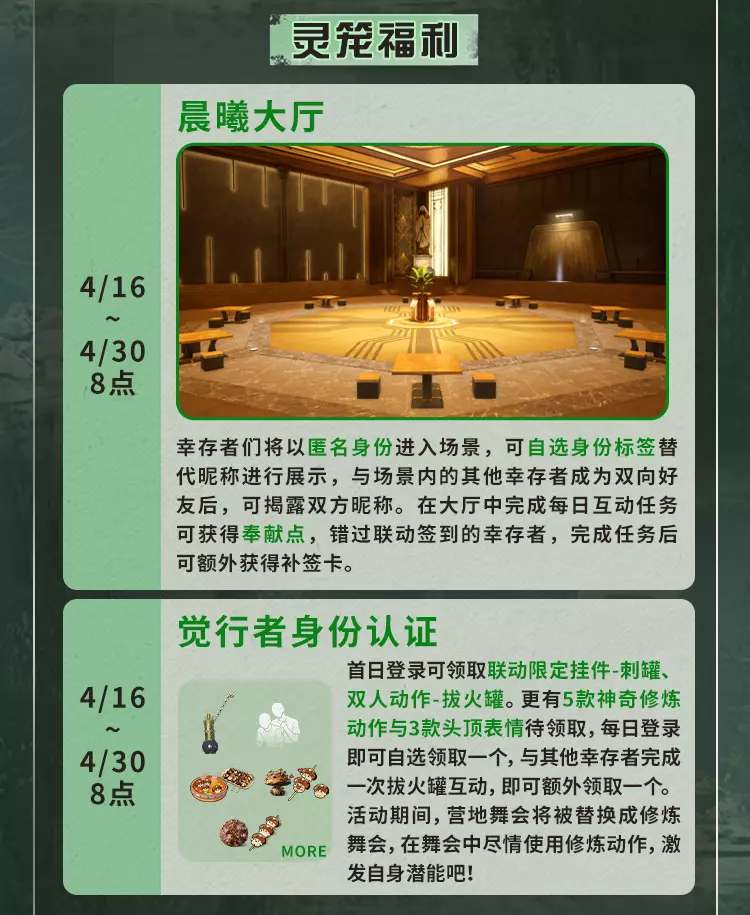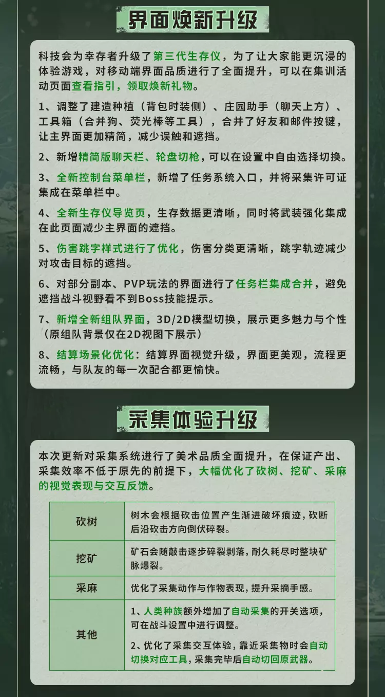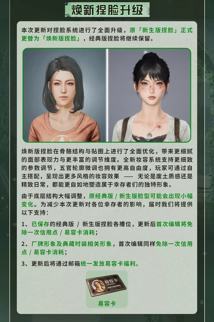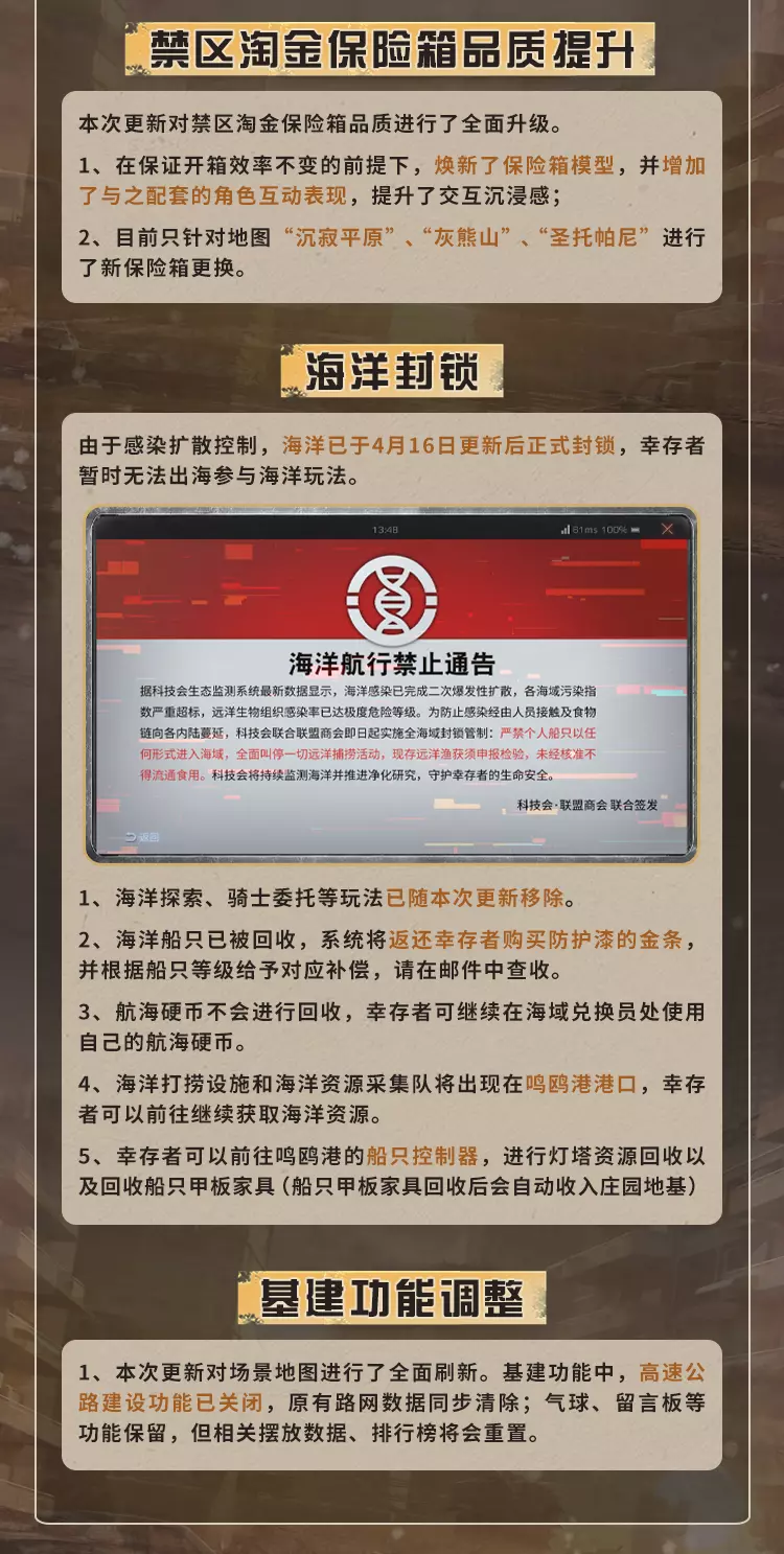 明日之后4月16日将对经典服、简单生存专服开启版本更新维护,本次更新带来废土焕新,完成美术、界面、采集、捏脸等多方面升级,开启灵笼联动活动可免费领限定动作,同时开启春季通行证、辐射诡楼新赛季,上线新异变核芯与多种活动,封锁海洋玩法并调整多项游戏机制。