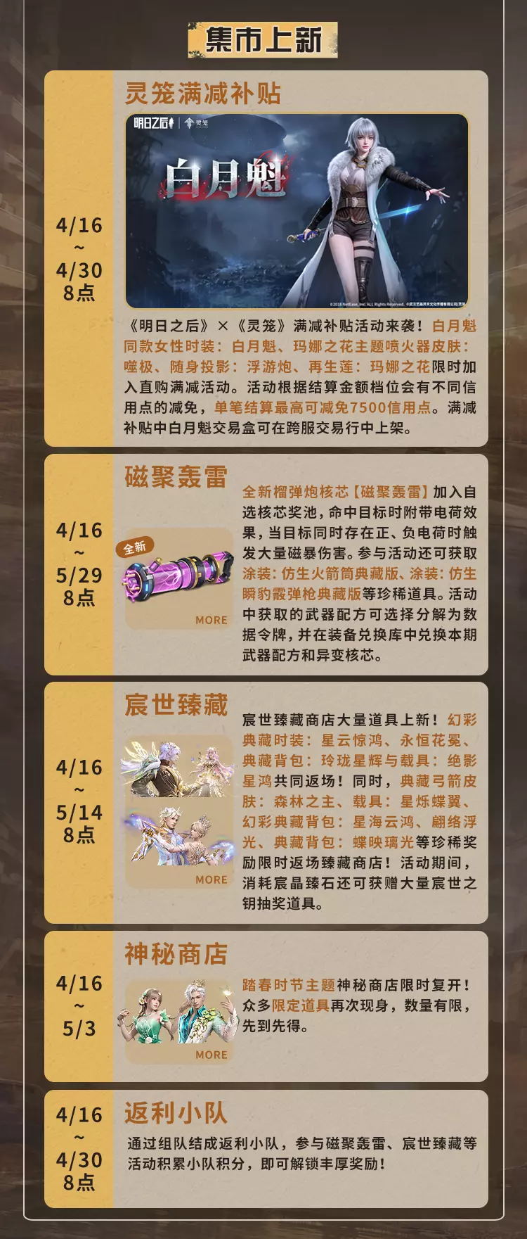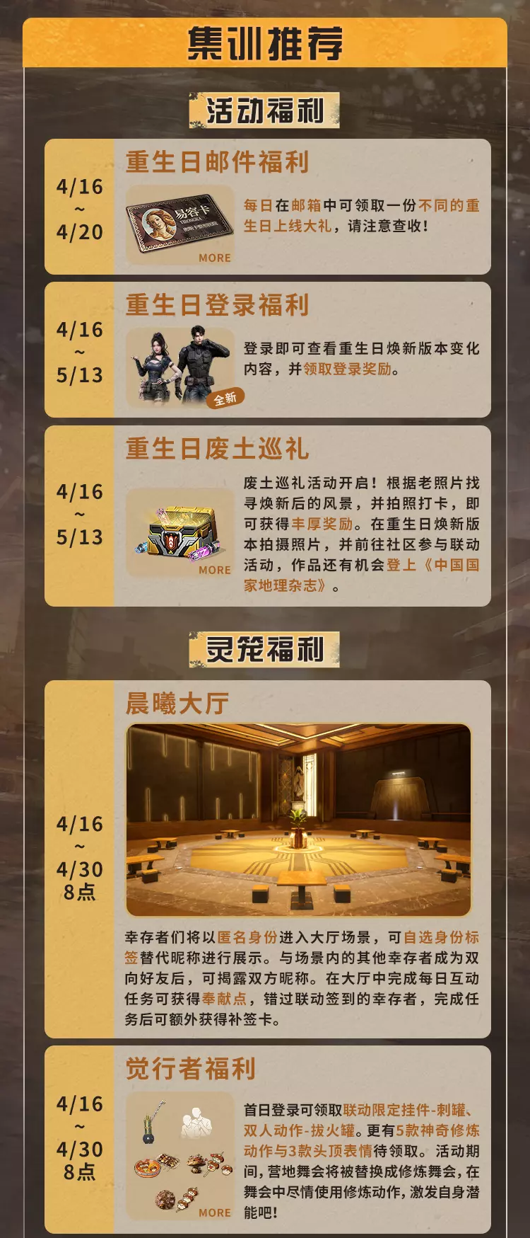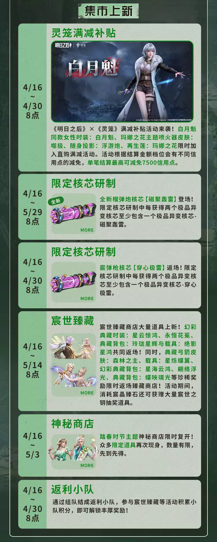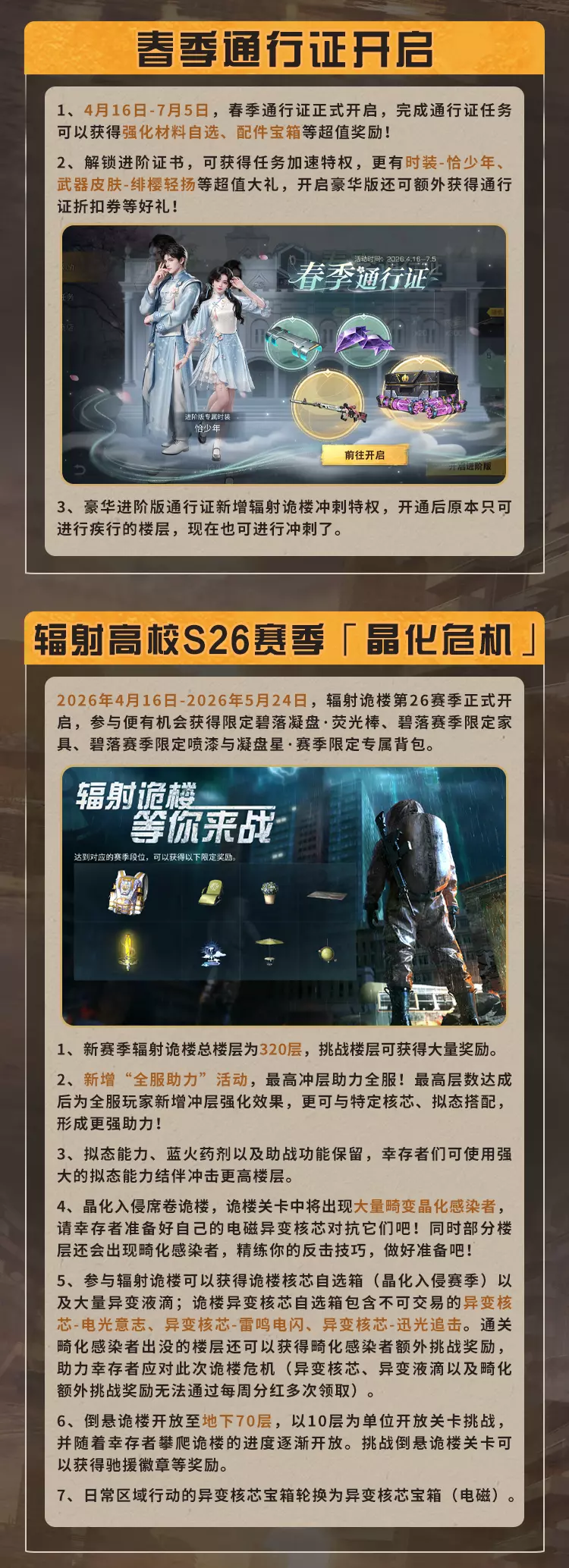 明日之后4月16日将对经典服、简单生存专服开启版本更新维护,本次更新带来废土焕新,完成美术、界面、采集、捏脸等多方面升级,开启灵笼联动活动可免费领限定动作,同时开启春季通行证、辐射诡楼新赛季,上线新异变核芯与多种活动,封锁海洋玩法并调整多项游戏机制。