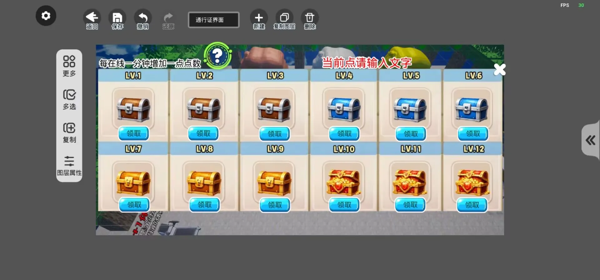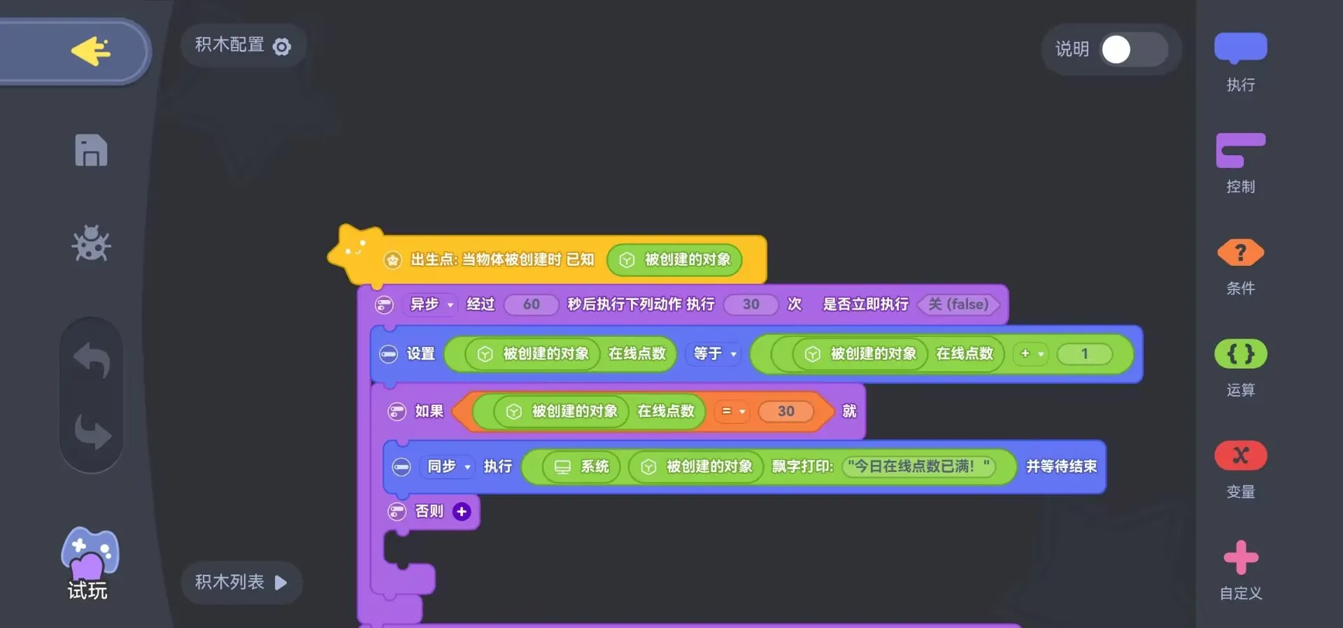 在线点数可替换为其他条件,比如等级、任务完成情况等,大家可结合自身地图需要进行设置,而图中在线点数的设置则是需要搭配出生点上的一个积木才能够生效,该积木的作用为计时,通过简单的计时器循环积木来实现每分钟在线点数+1,进而判定是否达到领取在线礼包的标准(在线点数达到30时的积木可无视)。