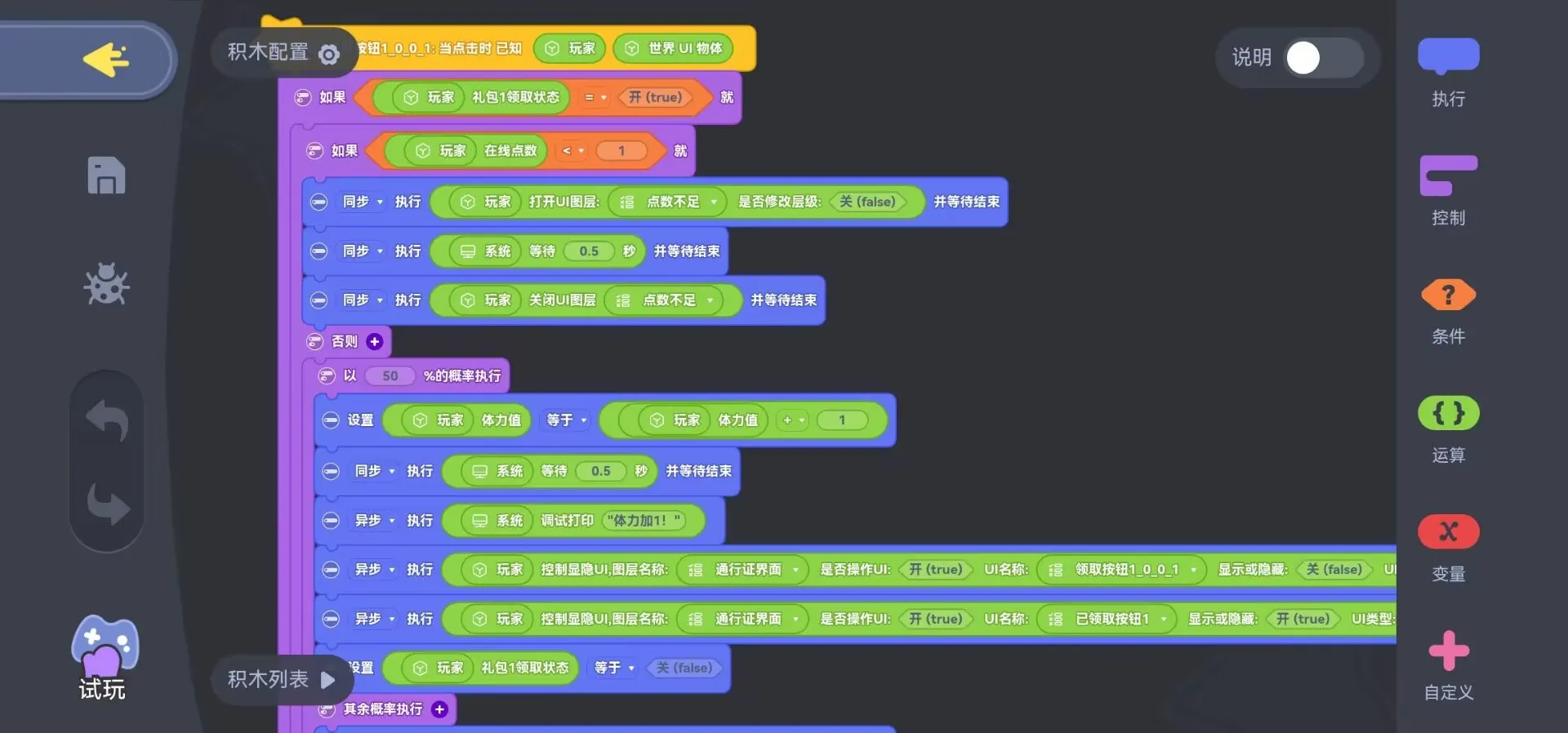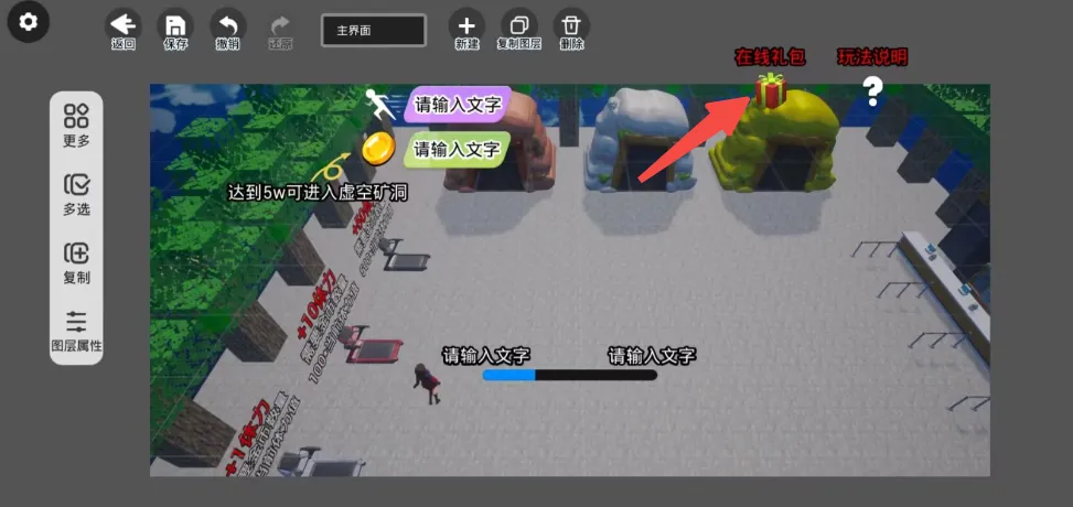 可以直接在礼包图标上进行设置,也可以单独添加按钮进行设置,也是礼包系统中需要用到积木的地方。