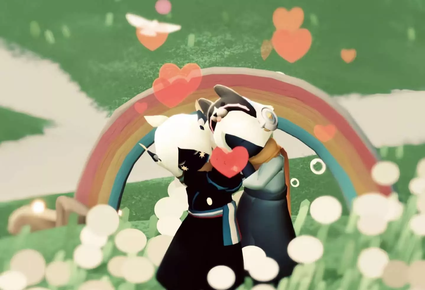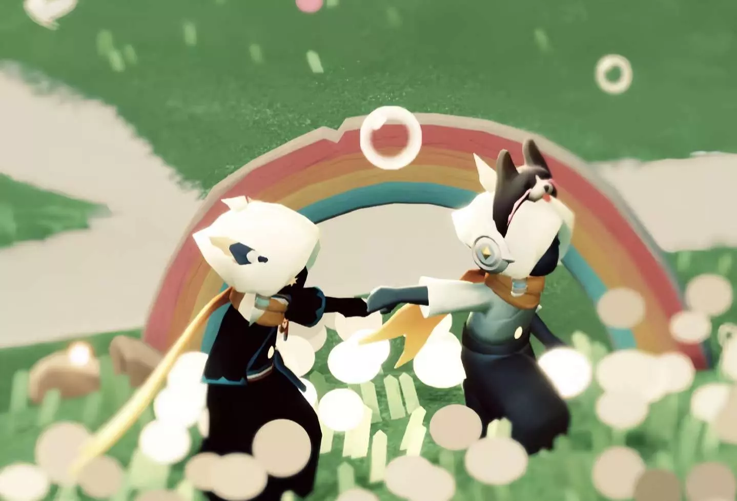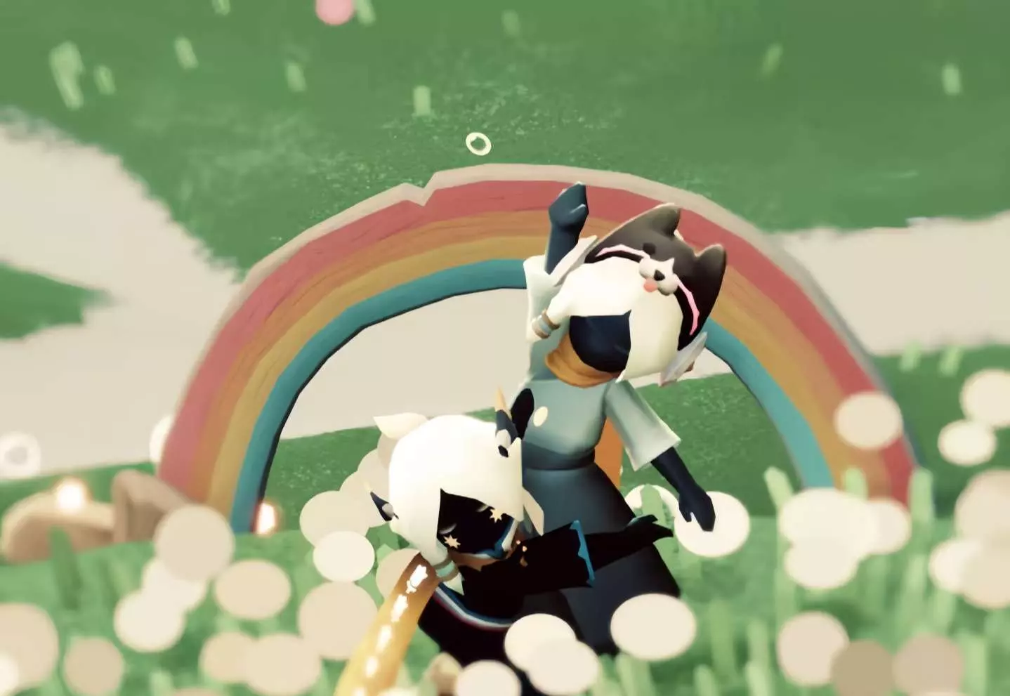这是一篇光遇合拍创作帖,分享了光遇游戏里两个角色在彩虹下互动的美图,传递出永远有方向、永远积极向上的氛围,属于光遇创作投稿内容。