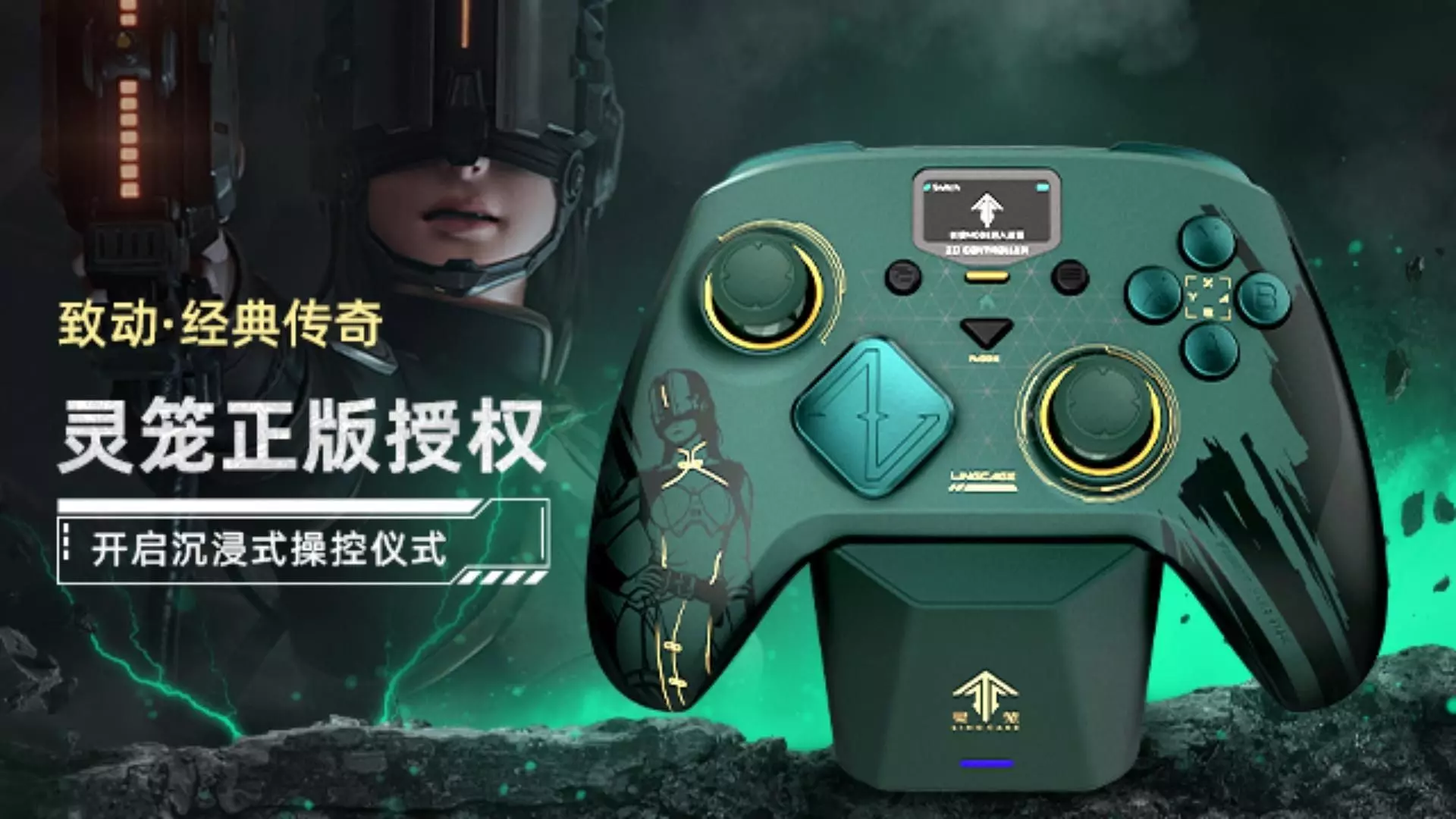 致动经典传奇灵笼联名款不仅是周边,而是完整的收藏套装 。 打开包装就能感受到收藏氛围。 手柄采用绿色与黑色的撞色设计,辅以黄色细节点缀,左侧握把上印有荷光者角色立绘。 配件部分同样用心:主题徽章、多组替换摇杆帽都整齐排布,颜色与角色元素保持统一。旁边的透明亚克力立牌让整个套装更具仪式感,把“限定”两个字真正落到了细节里。整体观感精致、有主题、有质感,是那种一打开就让人觉得“值了”的限定版组合。