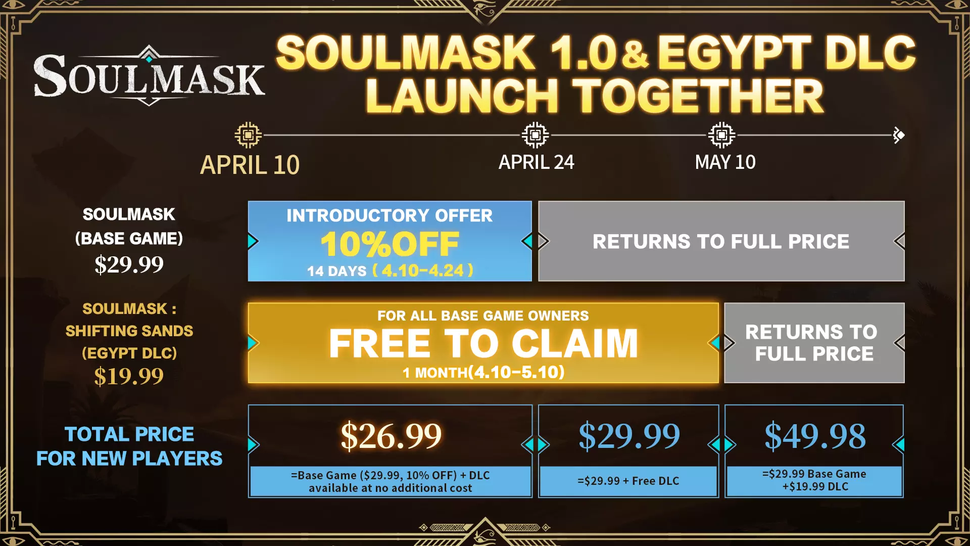 【仅在4月10日至5月10日期间可获取】。具体的小时可获取窗口将在我们的上线前常见问题中公布。 获取方式有两种: 1. 已拥有《灵魂面甲》的玩家将自动在其Steam库中收到该内容。 2. 1.0版本上线后,在4月10日至5月10日期间购买基础游戏的玩家也将自动获得【流沙】DLC。 请注意: 5月10日后,【流沙】DLC将恢复其常规价格19.99美元/72元人民币。 我们强烈建议所有玩家在版本1.0更新后启动游戏。1.0版本现已上线,请确认DLC已成功添加至您的账户。 最后,致所有自抢先体验阶段起就支持我们的酋长们——谢谢你们。 你们是第一批踏入这片雨林世界的人。 每一条反馈、每一个建议,以及每一次耐心等待,都已融入《灵魂面甲》1.0的每一行代码之中。 如今,在这个特别的里程碑时刻,我们认为是时候让新的酋长们也听听你们与《灵魂面甲》的故事了。 我们诚挚邀请您留下Steam评价,分享您的游戏故事与想法。 这段故事属于您,但它也是《灵魂面甲》最珍贵的财富之一。 同时,也感谢每一位刚刚加入我们的新酋长。《灵魂面甲》更新内容 1. 新增【空间分析】节点,修复后可在地下遗迹内提供路线指引。 2. 其他物体的生命探测功能已整合至【广域探测】节点。 3. 新增【拟态升华】开关。启用后,拟态可升级至2级(PVP模式不可用)。 4. 【文明、征服、生育】相关调整: i. 移除拟态形态,直接授予拟态技能。 ii. 提升部分节点数值。 iii. 重新设计部分节点效果。 iv. 重新设计拟态技能。 5. 【永恒之火】相关调整: i. 神圣模式下,将受到的伤害转化为生命值的比例降低。 ii. PVP模式下,高能水晶的持续时间缩短。 iii. 新增拟态升华。h. 影行者 i. 部分节点数值提升。 ii. 调整了一击必杀值的计算规则。 iii. 重做光学拟态,降低可侦测性。受到攻击不再结束潜行状态,且潜行状态下新增传送攻击。 iv. 新增拟态升华。 i. 野性印记 i. 部分节点数值调整。 ii. 降低神经协调带来的弓箭伤害加成,同时提升弓箭基础伤害。 iii. 缩短火焰引导的冷却时间。 iv. 新增拟态升华。 j. 铁血卫士 i. 部分节点数值调整。 ii. 拟态技能效果改为吸收一定比例的 incoming 伤害。 iii. 新增拟态升华。战术指引 i. 缩短粒子战斗服的冷却时间。 ii. 新增拟态升华。 自然启迪 i. 调整部分节点数值。 ii. 延长自然之心持续时间,缩短其冷却时间,新增动物为所有者承受伤害的能力,并将动物模式改为主动攻击行为。 iii. 新增拟态升华。 探索者 i. 缩短电磁屏障冷却时间,移除其对光电伤害的抗性,增强其对箭矢的抗性。 ii. 新增拟态升华。 新增状态系统,该系统会根据个人进度随时间变化。《灵魂面甲》更新内容 1. 新增外观记录功能,可保存部落成员的外观并复制到其他成员身上。 2. 调整外观/数据记录的默认数量为5个。 3. 新增数据处理功能,允许将部落成员数字化存储到专用物品中,或从数字化形态中恢复。 4. 减轻神秘石祭坛的重量。 5. 大幅缩短重塑所需时间。 6. 部分皮肤现在支持损伤状态调整。 7. 改进攀爬动画。 8. 建筑方面:工作站现在会自动与已放置地板地基的朝向对齐。 9. 建筑方面:增加悬挂火盆的放置范围。 10. 建筑方面:放置时可旋转屋顶和楼梯。 11. 建筑方面:尖顶屋顶系列结构现在可直接建造在地基上。《灵魂面甲》更新内容 1. 建筑系统调整: - 当玩家失去对角色的控制时,初始角色将自动坐在附近指定的【首领座椅】上。 - 建筑“Chicken Coop”已更名为【火鸡笼】。 - 墙壁类建筑现在支持与地基进行拼接。 - 放置预览时将显示碰撞区域。 2. 部落成员与追随者优化: - 提高部落成员和同伴的攻击意愿。 - 在篝火范围内防御的部落成员会自动从武器架上取用预设的武器、装备和食物。 - 同伴现在可以自动拾取背包,此行为可在部落成员行为设置中切换。 - 玩家执行相应采集动作后,同伴现在可以自动进行采集。同伴现在可以自动拆解其背包中的低阶物品。 同伴现在可以自动使用各类食物效果。 当家园遭受攻击时,处于被动攻击模式的部落成员会自动从武器架拿取装备进行反击。 优化了已部署同伴和坐骑的跟随行为。 新增数据库功能,可自动存档已收集的文本内容。 新增【意识X】,提供动态任务指引。《灵魂面甲》1.0更新内容 1. 新增【部落角色】系统,使部落成员的工作分配更加便捷。 2. 新增一种全新的远征建筑,你可以派遣部落成员前往前哨站获取奖励。 3. 多次成功抵御入侵后,将有机会吸引有才能的部落成员加入你的定居点。 4. 新增【训练场】,部落成员可在此学习天赋、提升天赋等级,并提高战斗技能上限(武器熟练度上限)。 我们将在这两个全新的世界中等你,你的声音将继续影响《灵魂面甲》未来的发展方向。 我们游戏中见! ——灵魂面甲团队《灵魂面甲》更新内容 1. 添加地牢重生点,并提供启用或禁用选项。 2. 添加商人。 a. 添加两种用于买卖商品的新货币。 b. 商人仅收购特定类型的物品。打开商人界面后,只有背包中标记为可出售的物品才能进行售卖。 3. 添加新游戏模式:【生存】、部落、【PVP模式】和战士。 a. 【生存模式】 i. 等同于原始默认的PVE体验。 ii. 调整了中后期等级提升,使后期进度更快。 b. 部落模式 i. 添加了专注于管理和扩张的部落 progression 系统,允许更完善的自动化和防御结构。 ii.c. PVP模式 i. 独立模式,基于官方原版PVP服务器定制