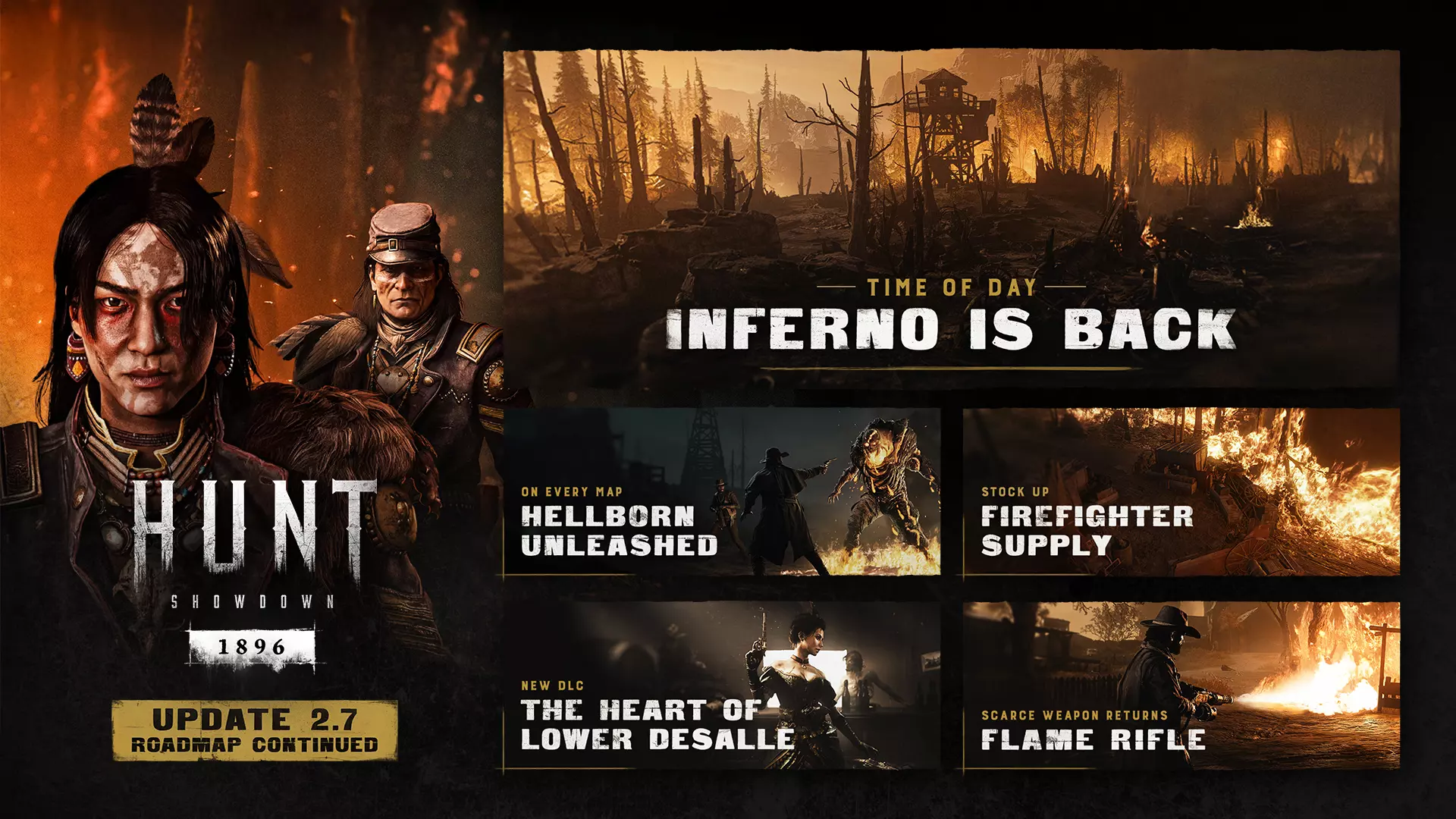 《猎杀:对决1896》公布恶魔之路后续更新路线图,2.7版本将于4月15日上线,本次更新将带来地狱回归、全地图解锁地狱诞生、消防员补给、全新DLC《德萨尔下游之心》,火焰步枪也将回归。