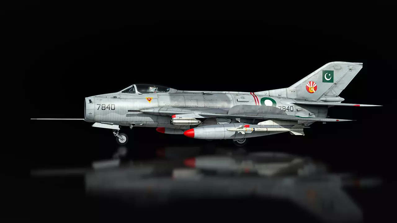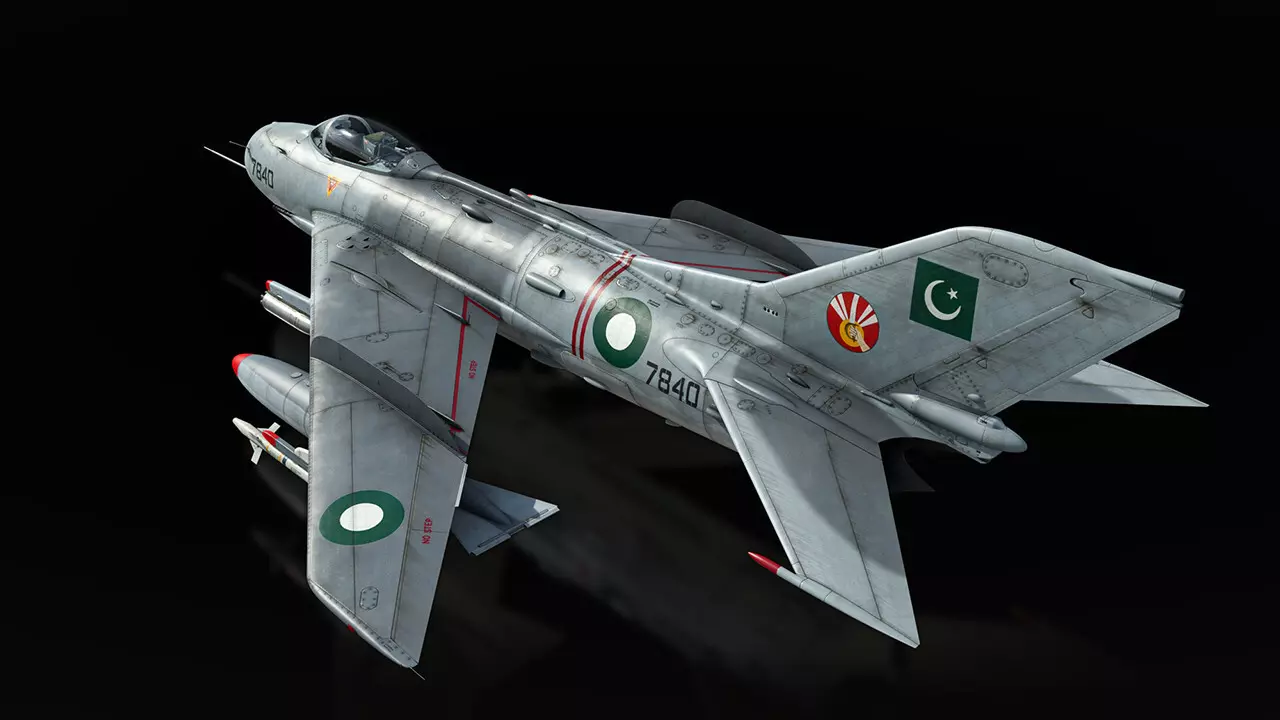 标准武器配置包括三门30毫米机炮,总备弹量210发,数量尚可但仍略显有限。巴基斯坦F-6C可挂载外部油箱,显著延长飞行时间。你可以选择两个机翼挂载油箱,每个容量760升,以及一个容量1140升的保形机身油箱,该油箱不会影响机翼下方挂点的武器挂载。在空战中,F-6C携带两枚AIM-9P导弹,这是美国AIM-9J响尾蛇导弹的出口型号,配备有后向红外导引头。执行对地攻击任务时,F-6C可携带100千克和250千克炸弹,以及S-5KP火箭弹。