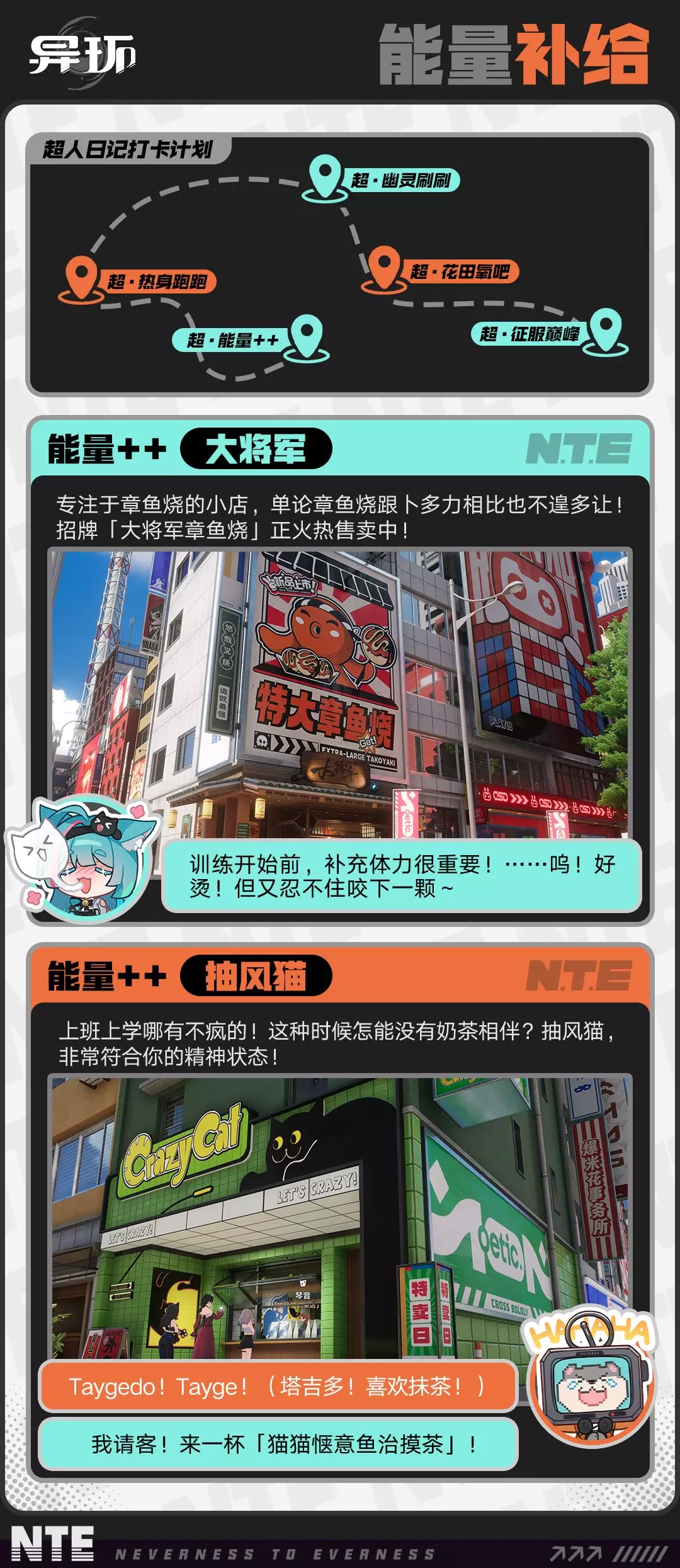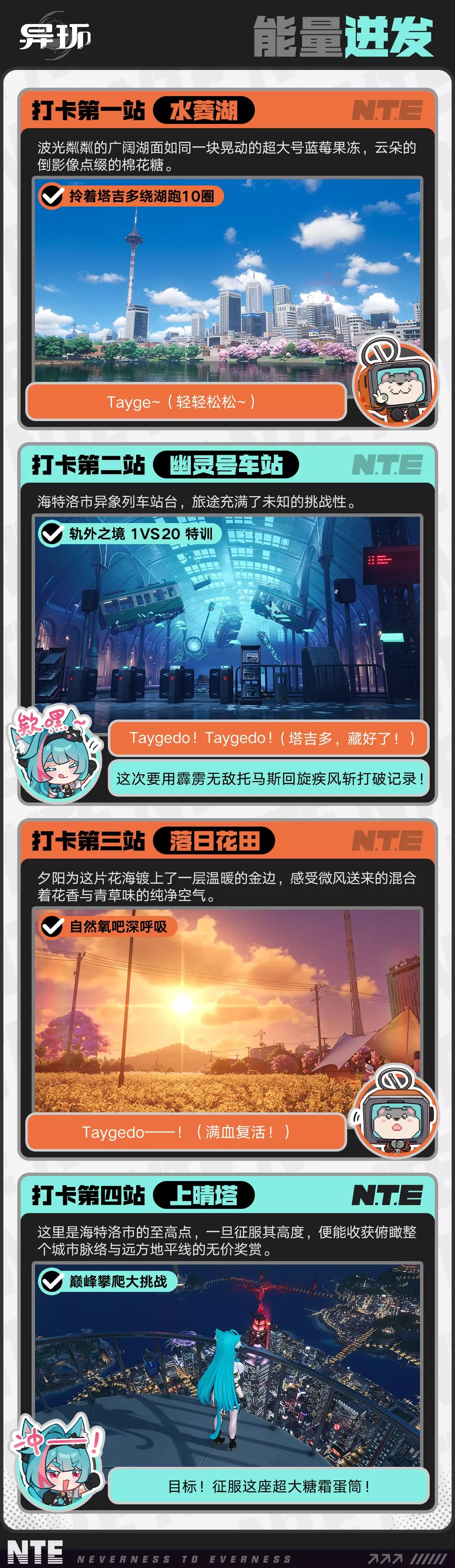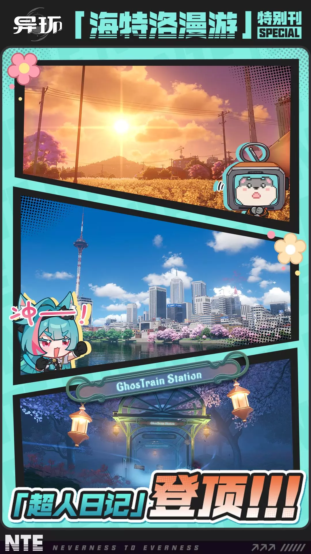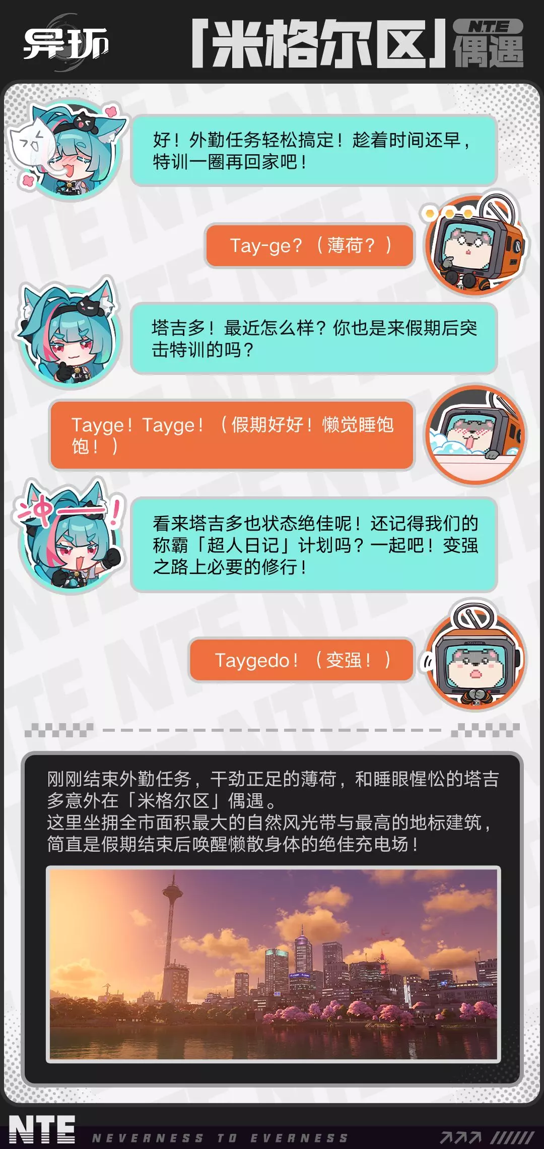 这是异环海特洛漫游特别刊「超人日记」,结束外勤任务的薄荷与睡眼惺忪的塔吉多在米格尔区偶遇,二人一同开启超人日记登顶计划,完成打卡特训后成功登顶积分榜,却突发降雨导致塔吉多进水,最终薄荷带塔吉多返回维修。