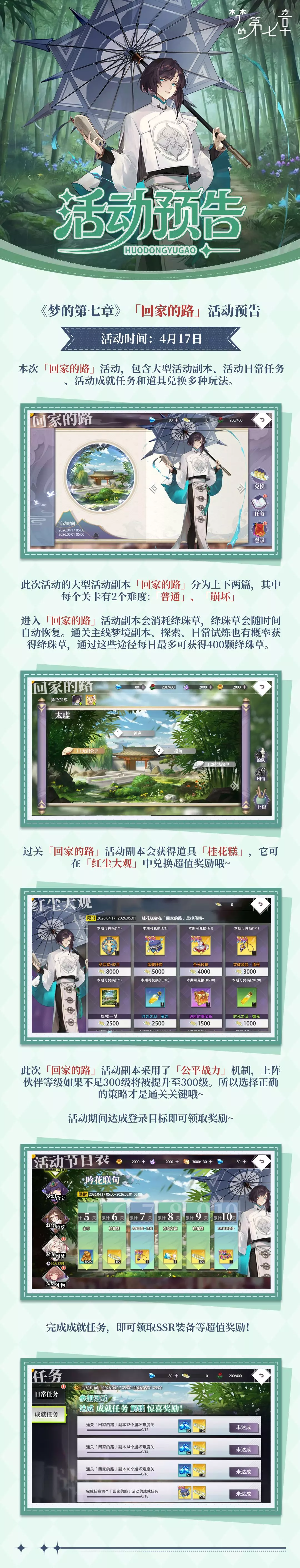《梦的第七章》「回家的路」活动将于4月17日开启,活动包含活动副本、日常任务、成就任务与道具兑换多种玩法。活动副本分上下两篇,设普通、崩坏双难度,采用公平战力机制,通关可获兑换道具,完成任务可领取SSR装备等丰厚奖励。