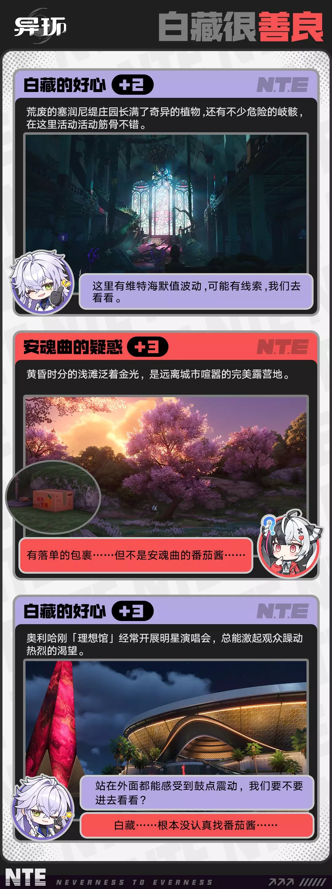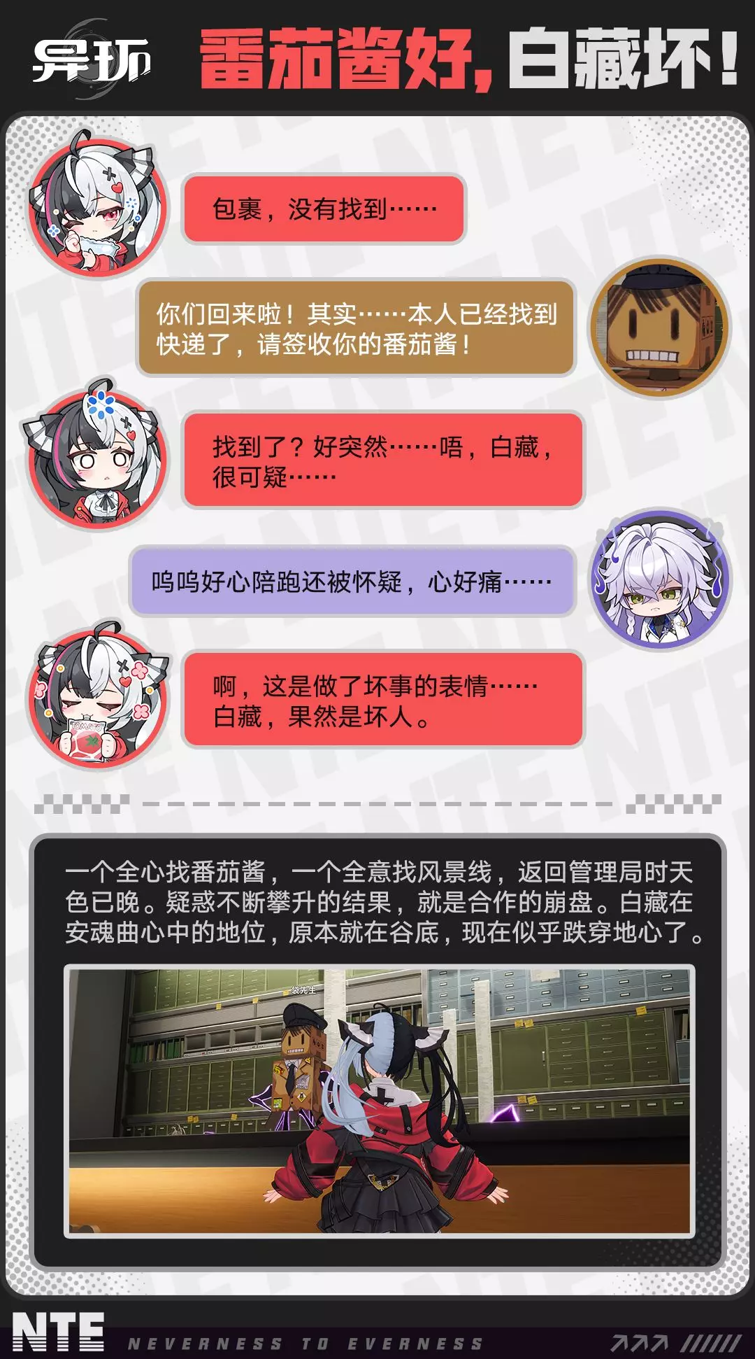 这是异环《海特洛漫游》特别刊故事,白藏为了让爱睡觉的安魂曲出门遛弯,串通袋先生谎称安魂曲的番茄酱包裹失踪,引导安魂曲逛遍未闻浦的各处景点,最后包裹回到管理局,安魂曲认定白藏做了坏事,调侃番茄酱好,白藏坏。