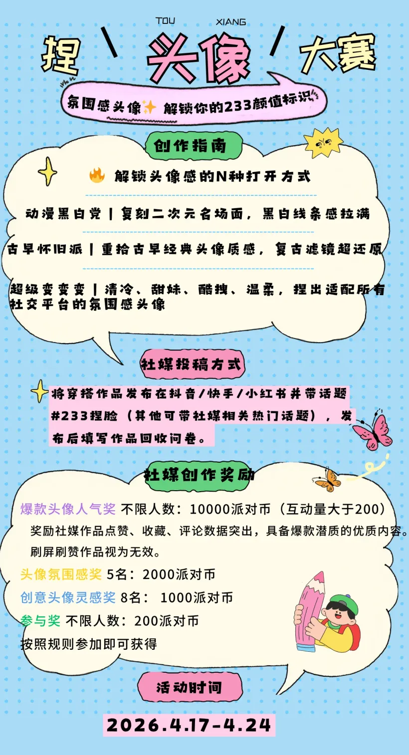 233平台举办捏头像大赛,可打造不撞款、高还原、有质感的专属头像,适配各类社交平台。本次捏头像大赛设有多个创作奖项,参与者按要求在抖音、快手、小红书带话题#233捏脸发布作品后填写问卷即可参与,活动时间为2026年4月17日-4月24日。