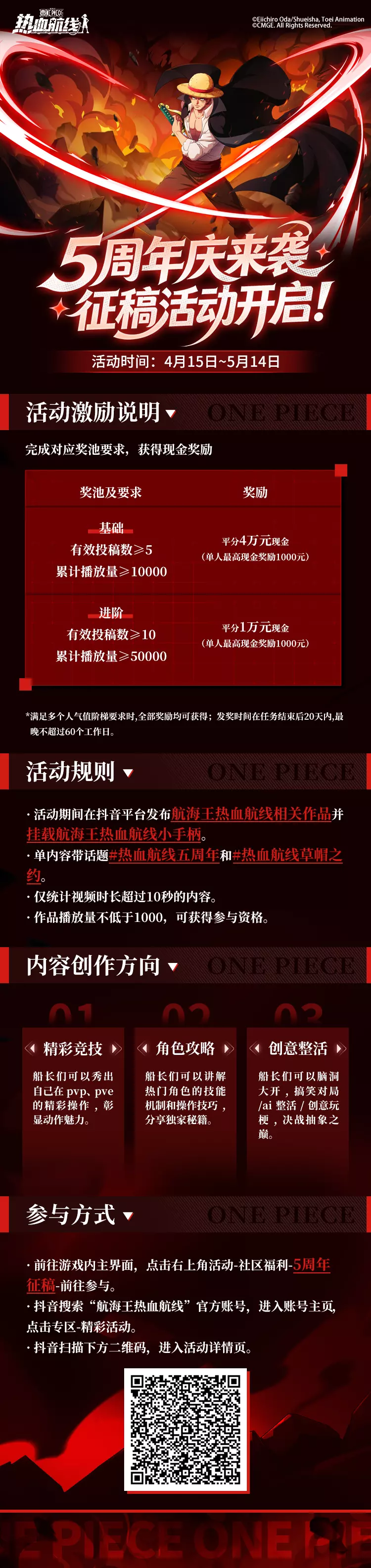 航海王热血航线五周年庆即将来袭,现已开启五周年征稿活动,活动时间为4月15日至5月14日,创作者按要求发布符合规范的相关视频即可参与瓜分五万元现金奖池,最高可获千元现金奖励。