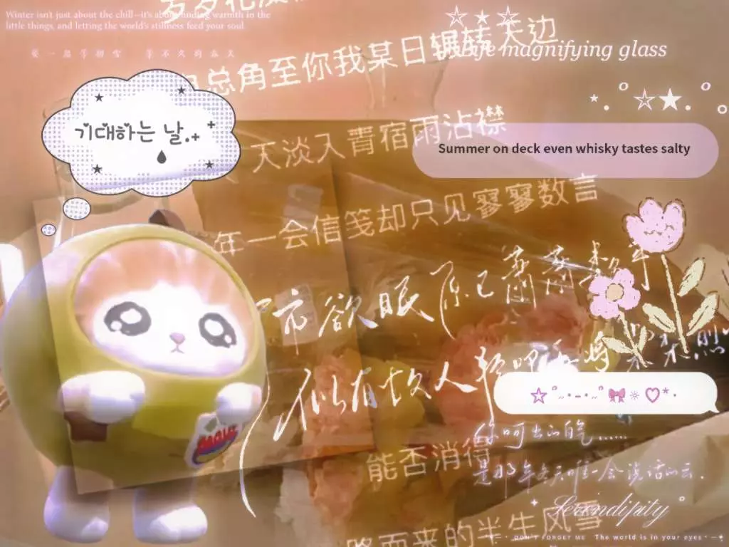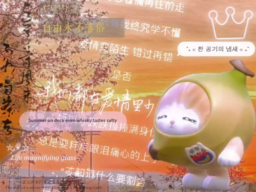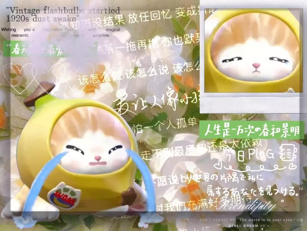 这是一篇蛋仔派对创作投稿的精华申请帖,分享了一组带有伤感文艺文案的香蕉猫蛋仔美图,还有相关氛围感花卉、风景图,风格治愈又略带emo,参与蛋仔派对OOTD征集令。