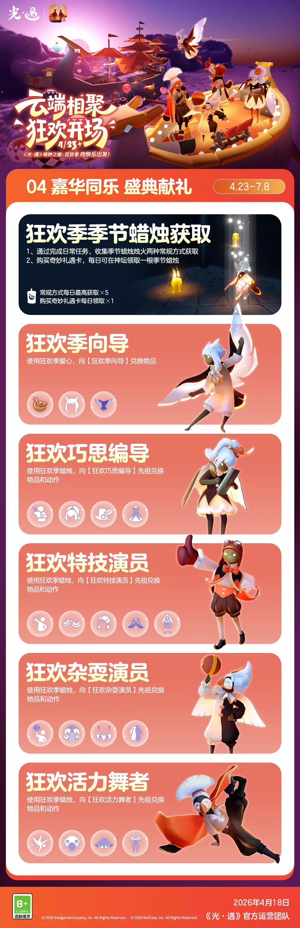 季节蜡烛是兑换季节赠礼的重要道具。活动期间,光之子们可通过完成日常任务、收集季节蜡烛烛火获取,或购买奇妙礼遇卡每日领取额外季节蜡烛。使用季节蜡烛可向「狂欢巧思编导」「狂欢特技演员」「狂欢杂耍演员」「狂欢活力舞者」四位先祖兑换物品与动作;使用季节爱心可向「狂欢季向导」兑换专属物品。
