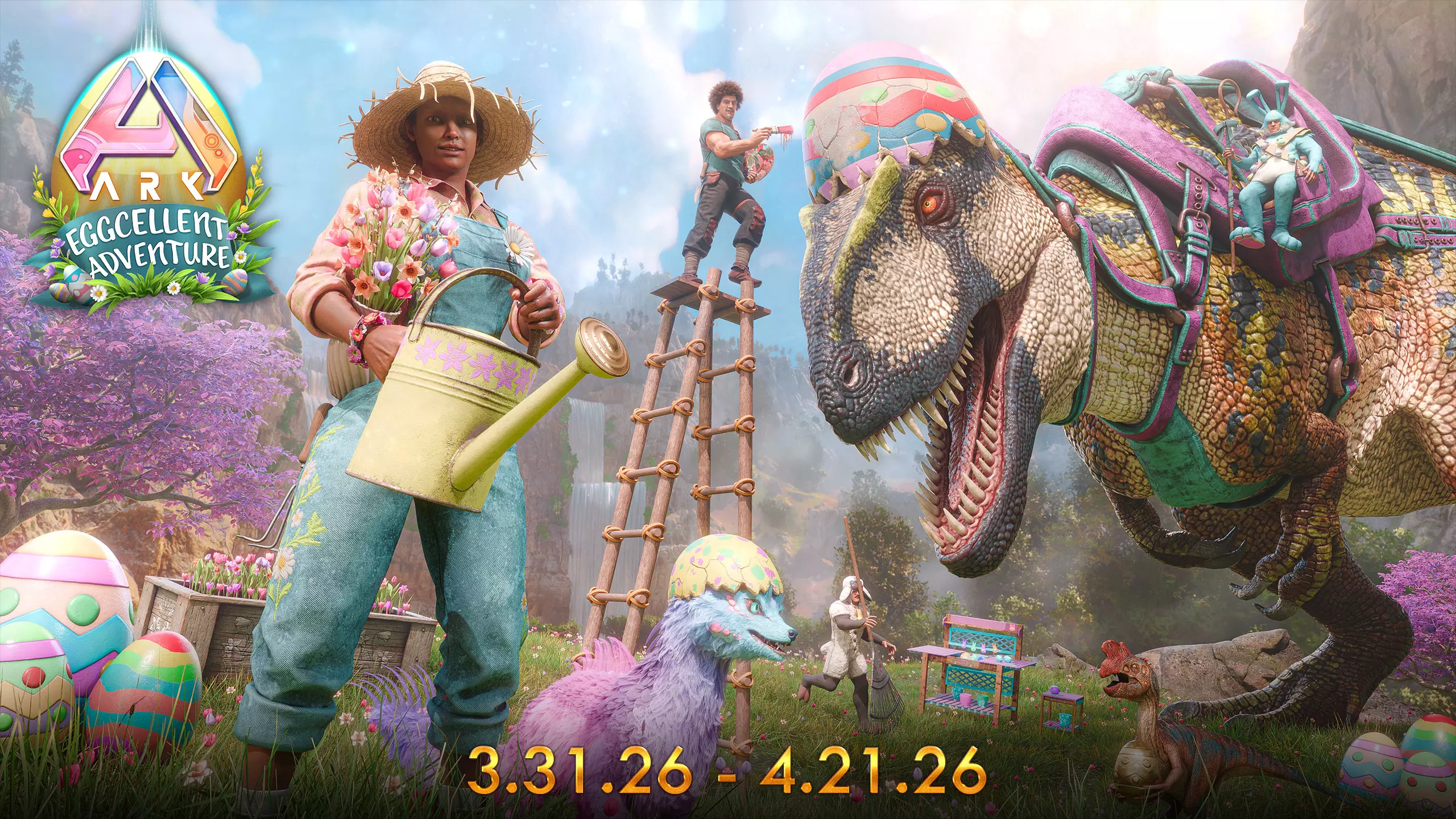 《方舟:生存飞升》【复活节冒险】活动已延长至4月21日!现在你有更多时间追踪野生的【兔子渡渡鸟】和【兔子窃蛋龙】的踪迹,并收集散落在方舟各地的【兔子蛋】。这些节日彩蛋可以用来涂鸦取乐,也能用于制作特殊的节日主题外观物品,包括季节性服装和【迷你宠物】。