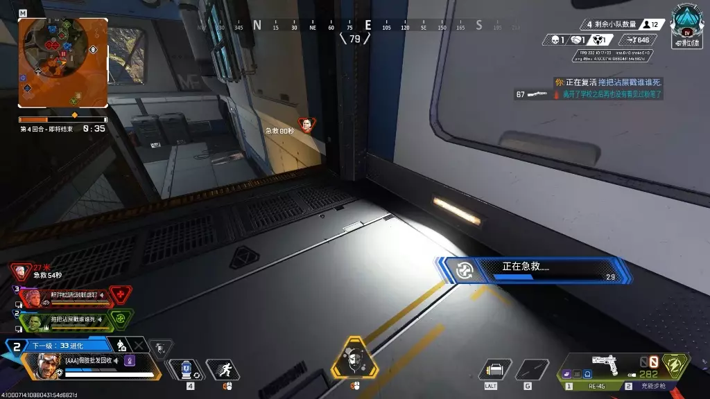 这是《Apex英雄》的游戏对局内容,玩家在战斗中遭遇护甲厚实的对手,陷入无奈处境,过程中经历队友倒地、搜刮死亡之箱、使用护盾电池、交战攻击等对局环节。
