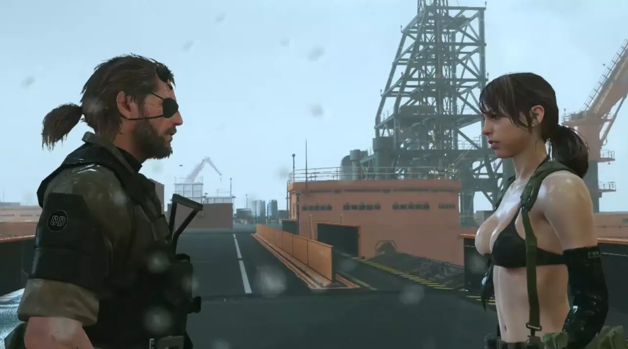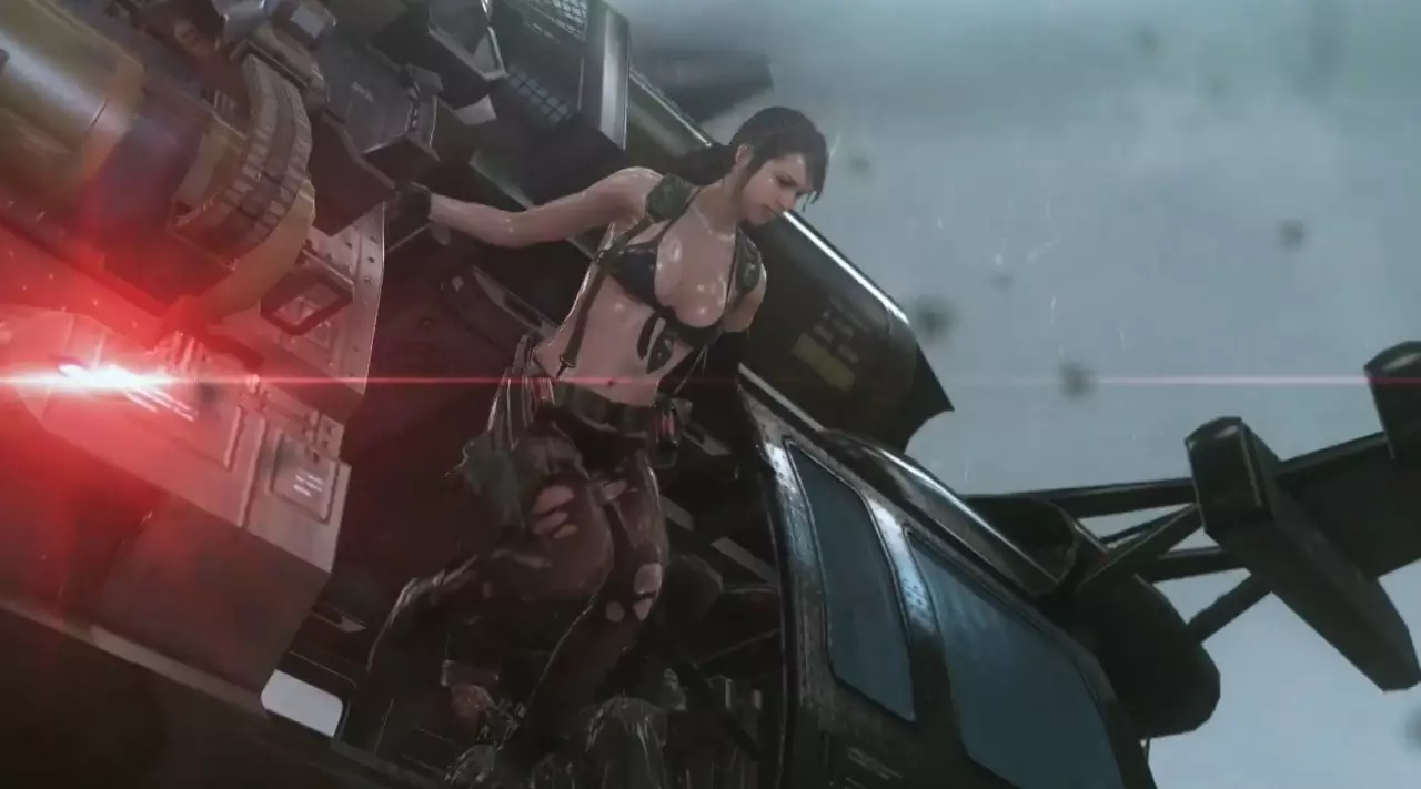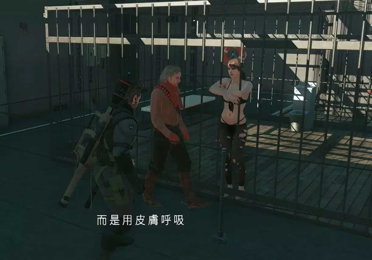 用脚充电这一设定,不禁让人想起游戏《合金装备5:幻痛》中靠皮肤呼吸的角色【静静】。 《合金装备5:幻痛》 【静】(Quiet) 其经典形象包括黑色胸衣与破洞黑色丝袜等元素(非常性感) 静静穿衣少的原因(官方解释/设定):她靠皮肤来呼吸,所以不能穿太多衣服(只在关键部位进行遮挡)。 由于静静在与Big Boss的战斗中深受重伤,寄生虫覆盖了她烧伤的表皮使她能够通过皮肤“呼吸”,因此穿太多衣服会导致窒息。