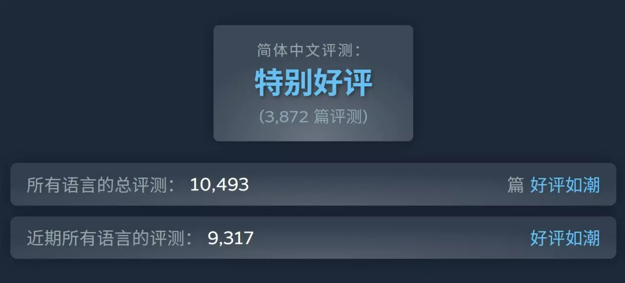 《死亡搁浅2:冥滩之上》 发售一个月后,目前steam所有语言的总评测:【好评如潮】(10,493篇评测) 简体中文评测: 【特别好评】 (3,872 篇评测)