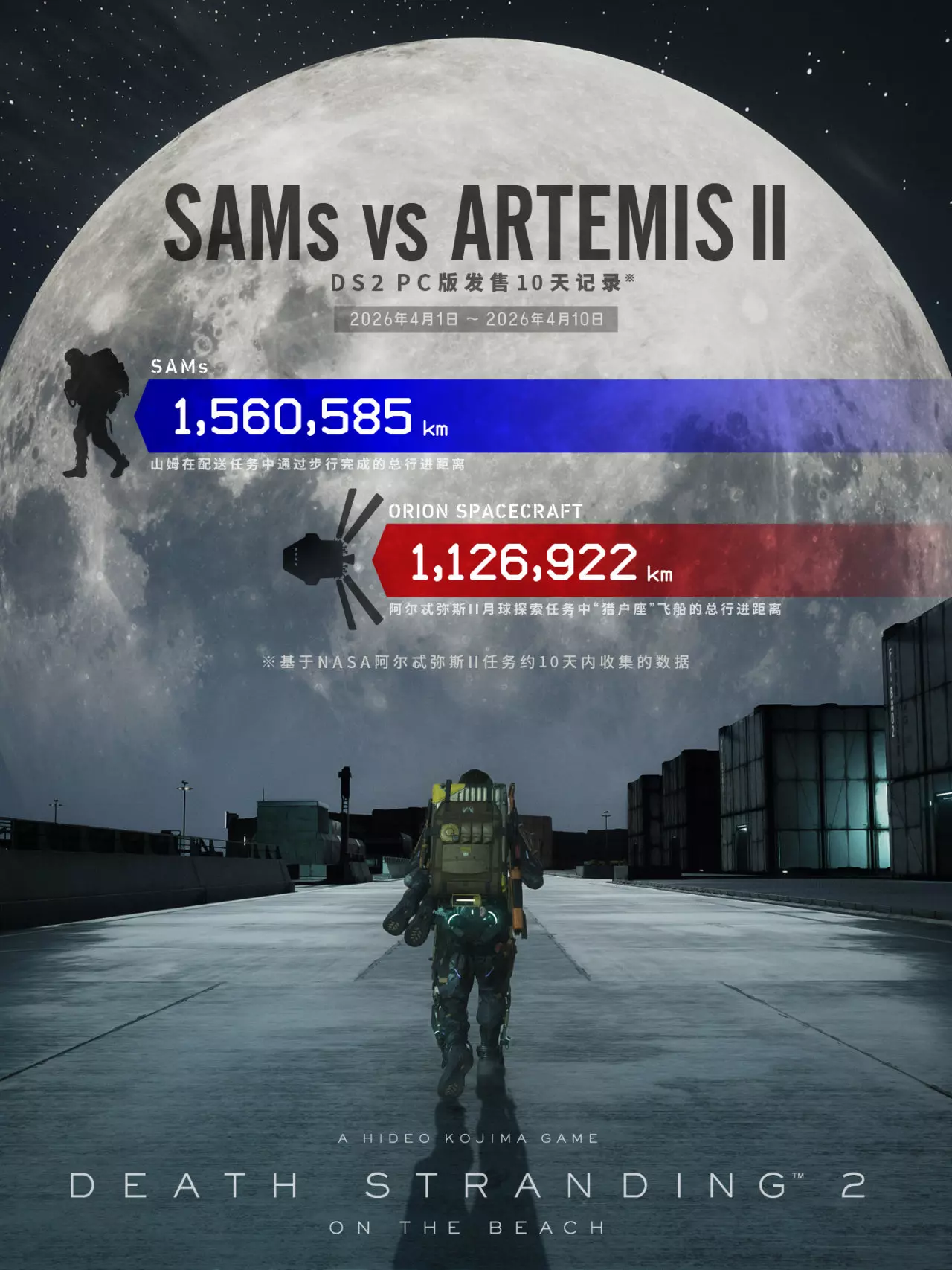 《死亡搁浅2:冥滩之上》 今日,【小岛工作室】官方发布了《死亡搁浅2:冥滩之上》PC版发售满月贺图。 在DS2发售后的10天内,全球各地的【山姆们】一共行走了1,560,585 km的路程。 对比:阿耳忒弥斯2号的航行时间也为10天左右,总航行距离为1,126,922 km(美国航空航天局阿耳忒弥斯登月计划首次载人飞行任务)。