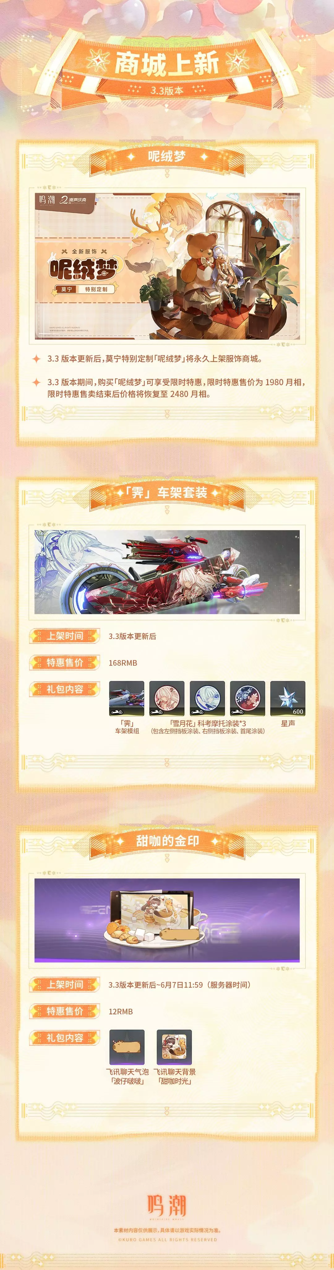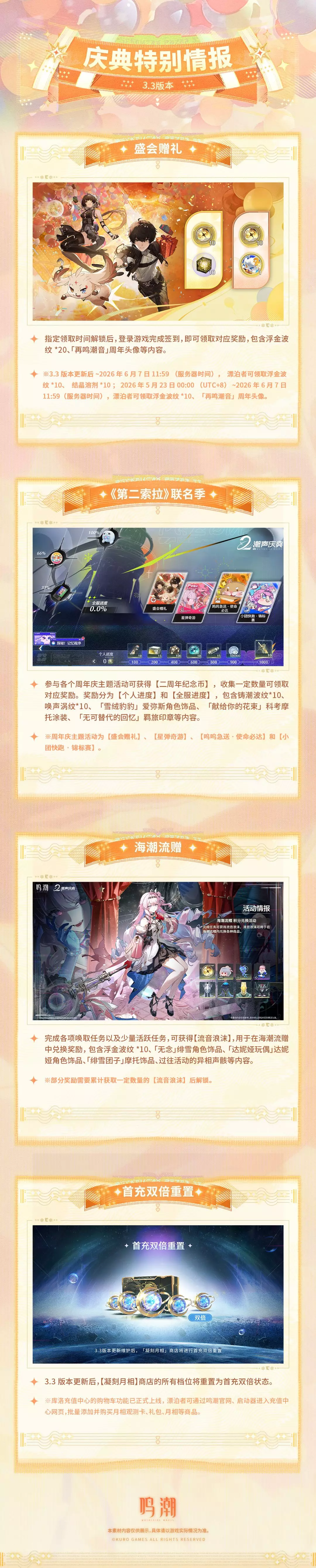 本期为漂泊者带来3.3周年版本的活动情报和商城内容,参与各类活动漂泊者可累计获得浮金波纹、铸潮波纹、唤声涡纹、角色饰品、科考摩托涂装、科考摩托饰品、星声等多种奖励,欢迎漂泊者查看!