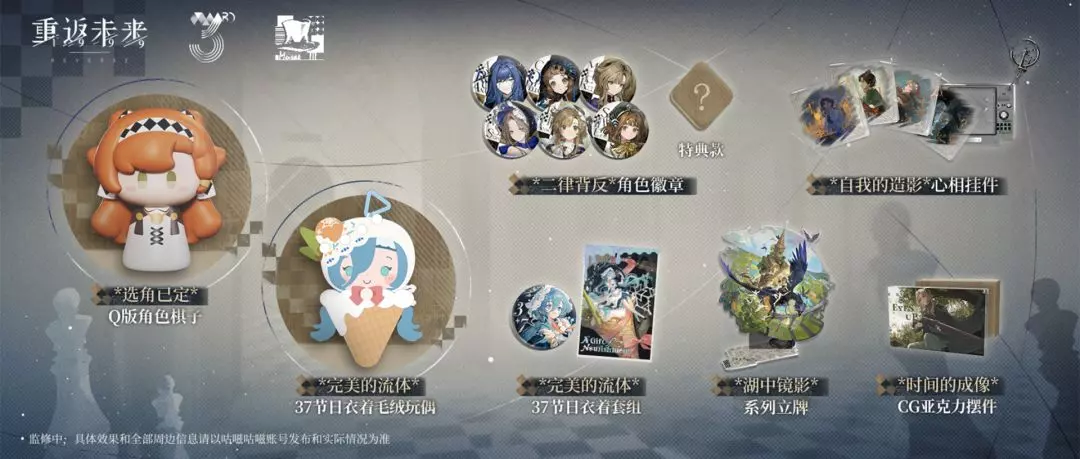 直播节目所展示商品【*选角已定*Q版角色棋子】、【*完美的流体*37节日衣着毛绒玩偶】、【*完美的流体*37节日衣着套组 】、【*二律背反*角色徽章】【*湖中镜影*系列立牌】【*时间的成像*CG亚克力摆件】【*自我的造影*心相挂件】将与其他第二十八期商品同时上架。后续上新请关注咕嗞咕嗞1999