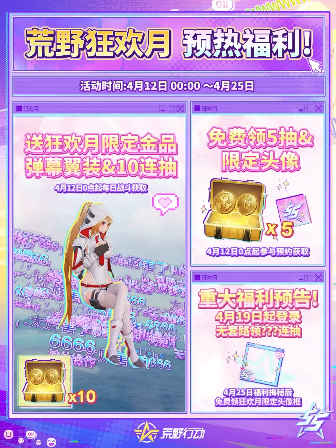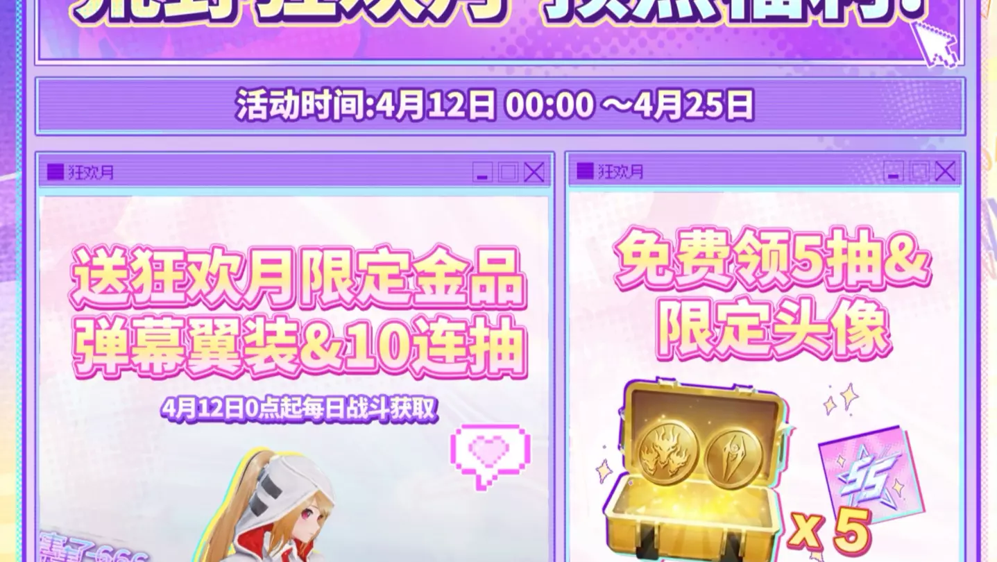荒野行动开启狂欢月福利,4月19日12点起登录无套路领100抽,还有后续上线福利;同日10点,6元即可解锁全新粉装【咔嚓小骨】,男女款有区分,趣味十足。