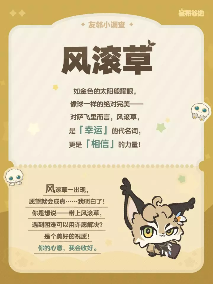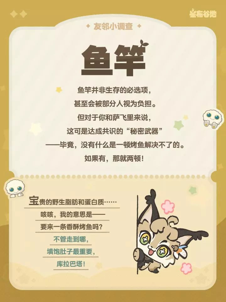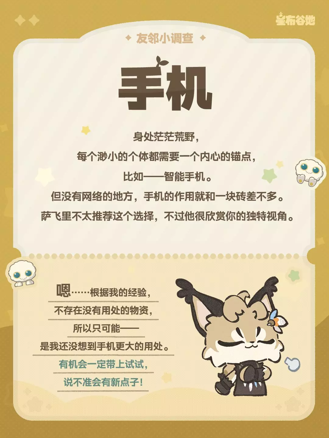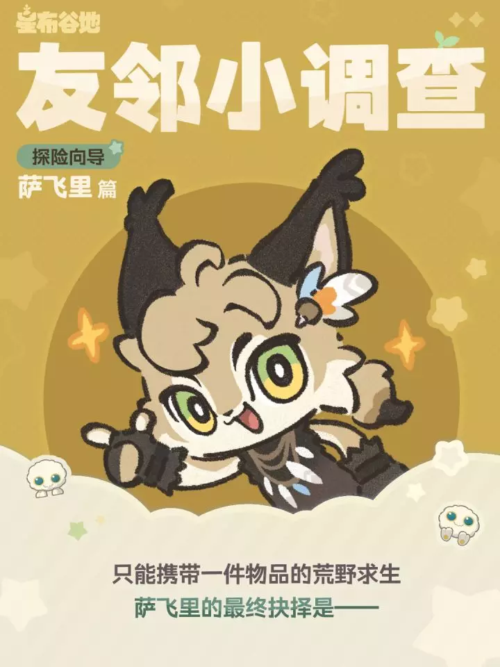 星布谷地发起友邻小调查,探险向导萨飞里针对荒野求生只能带一件物品的命题,探讨了风滚草、鱼竿、手机这几类物品,邀请大家一起讨论荒野求生必备好物。