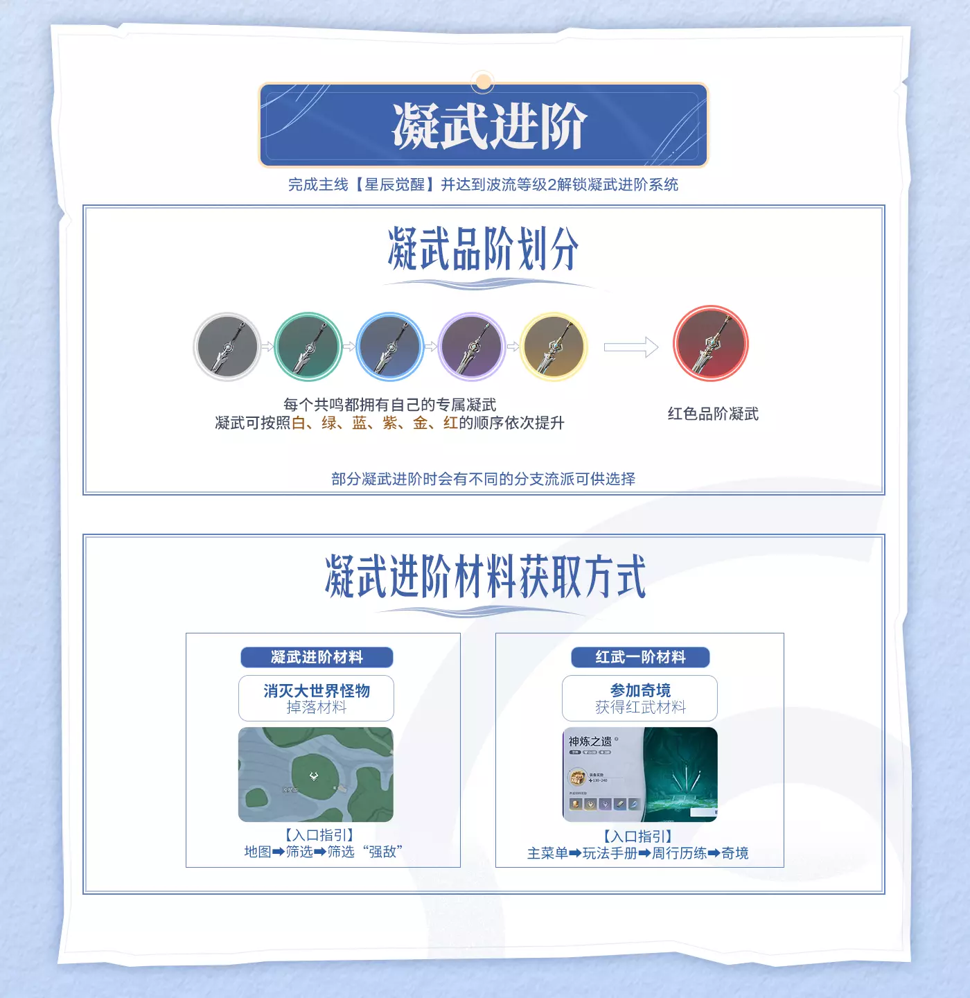 这篇攻略介绍了凝武战力提升方法,分为升级突破和进阶两部分:1-15级凝武用环金、铸星材料升级突破,15级后还需突破材料;铸星材料可从稷云阵、朝闻道商店获取,突破材料来自锻锋砺炼。完成指定主线和等级可解锁凝武进阶,按白到红品阶提升,材料可通过击杀大世界强敌、参加奇境获取。