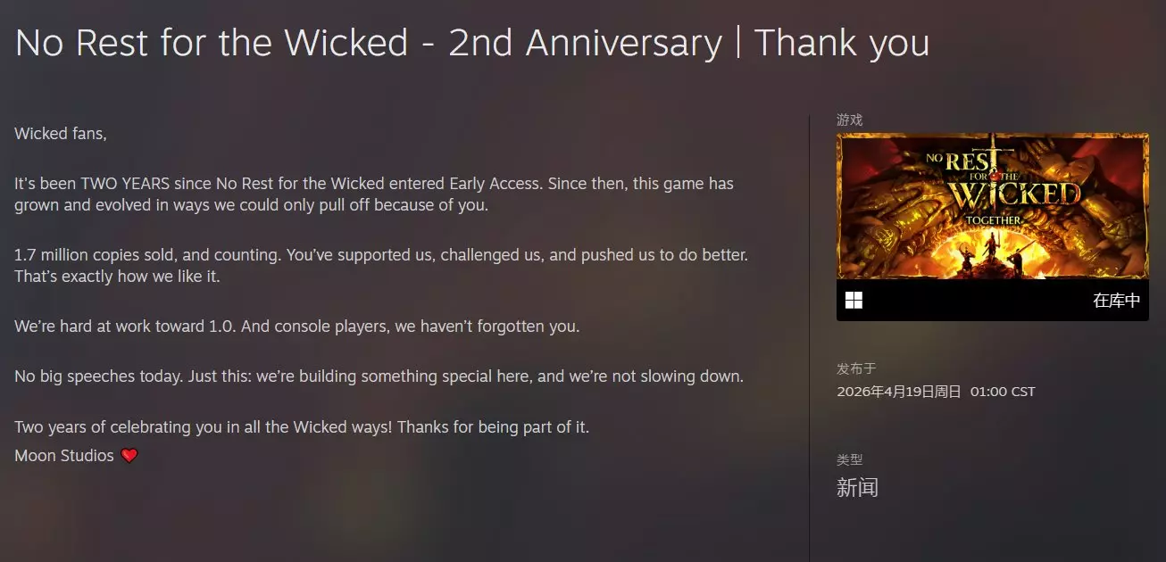 《恶意不息》抢先体验迎来二周年,全球累计销量已突破170万份且持续增长。目前团队正全力开发1.0正式版,正式版价格将永涨至60美元,还计划登陆主机平台。