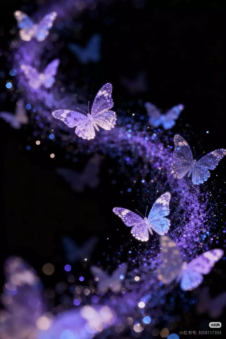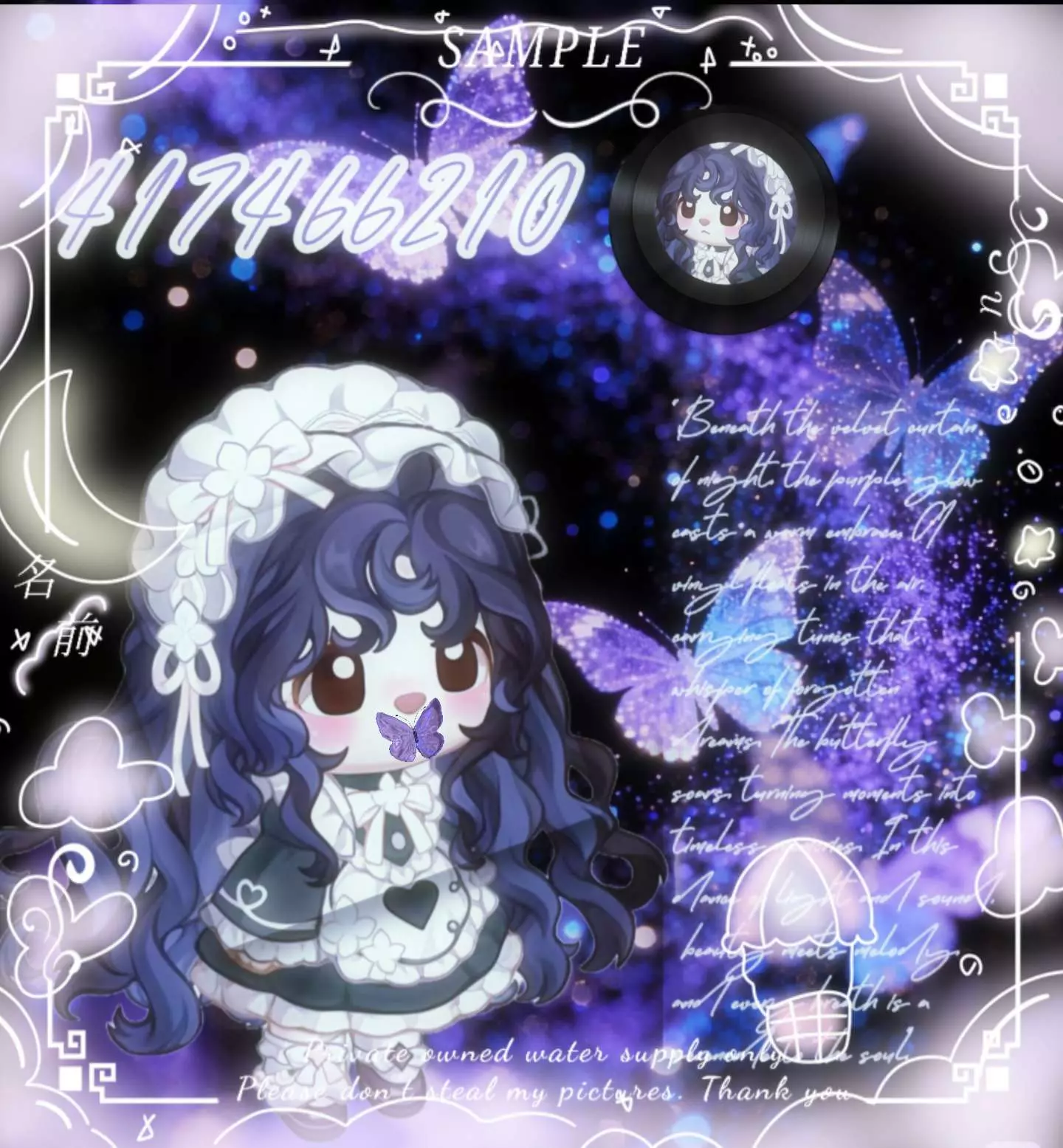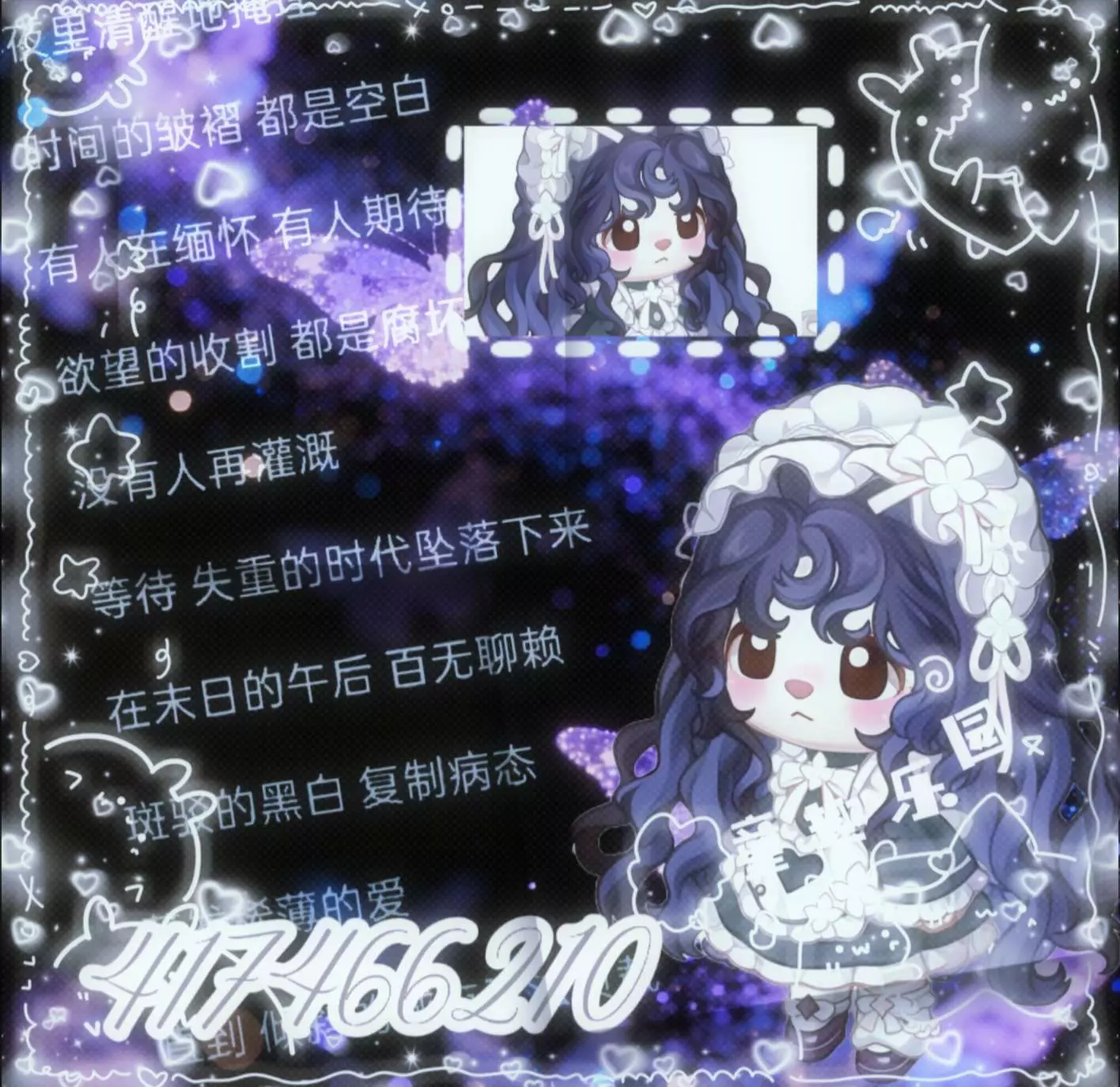 这是一篇奥比岛相关的图文帖,展示了带有暗黑末日风格的奥比岛角色穿搭美图,搭配紫夜蝴蝶元素与氛围感文案,营造出独特的忧郁氛围感。
