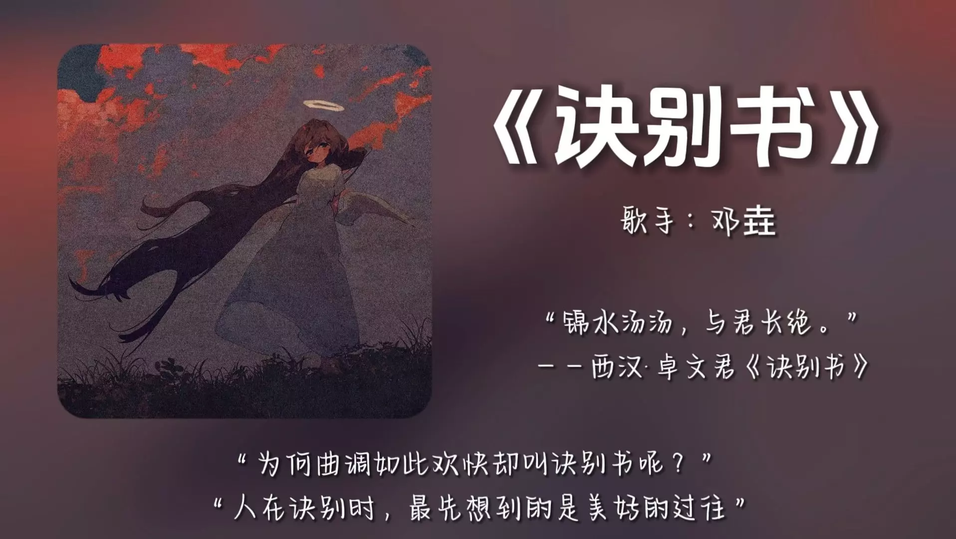 《诀别书》 歌手:邓垚 原曲传送门:https://mus ic.163.com/#/song?id=2038191895 *本视频仅供音乐推荐与试听,请移步原…