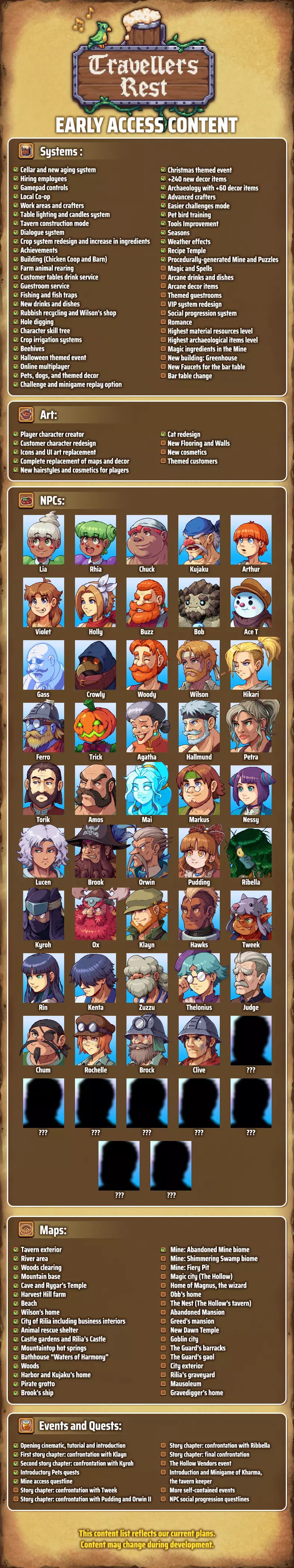计划内容 我们也一直在听取社区关于游戏未来内容的反馈,因此我们整理了这份《旅人小憩》的内容图表,其中包含了即将推出的内容以及我们目前已完成的内容。