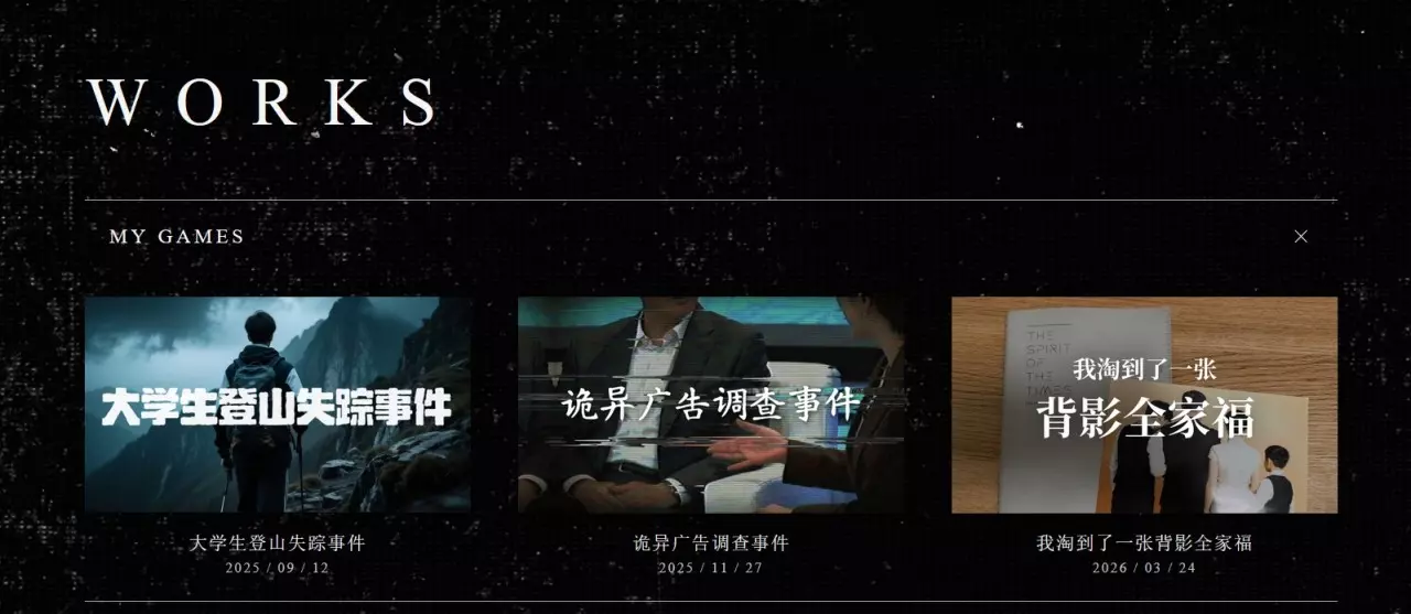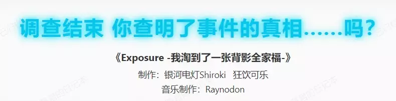 银河电灯解谜新作《Exposure -我淘到了一张背影全家福 》 ARG(现实入侵型游戏)(游戏作者的一次尝试)。 玩家不扮演任何角色,以一名真实网友的视角围观并破解一桩谜团重重的事件。 虚构故事。