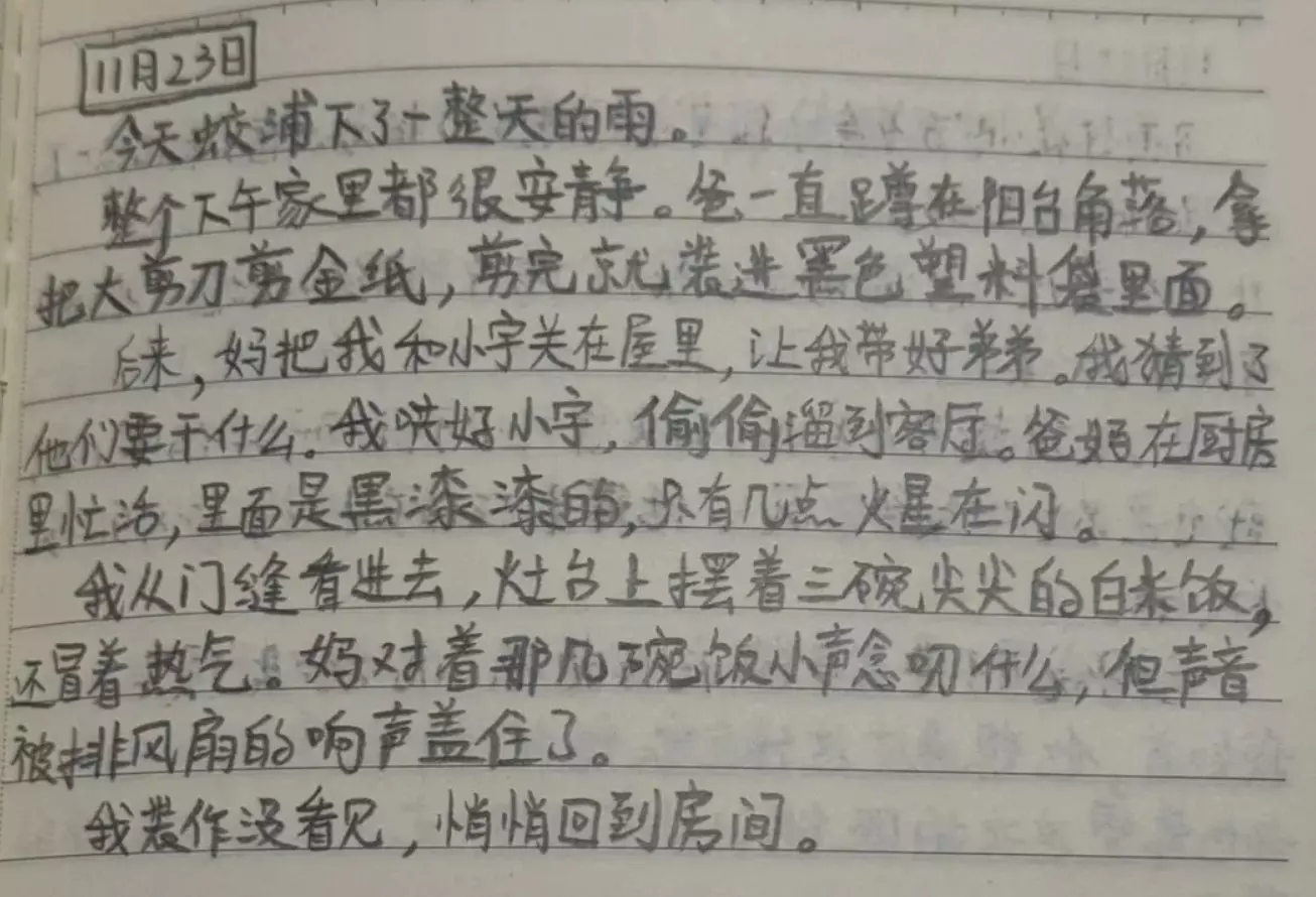 车祸发生后,周家四口没有报警,而是选择逃离现场(逃逸)。 这一年(2013年),田朔15岁,周宁12岁,周小宁5岁。 2013年11月24日,日记:"脑袋好乱,我不是故意的,小宇也不是"