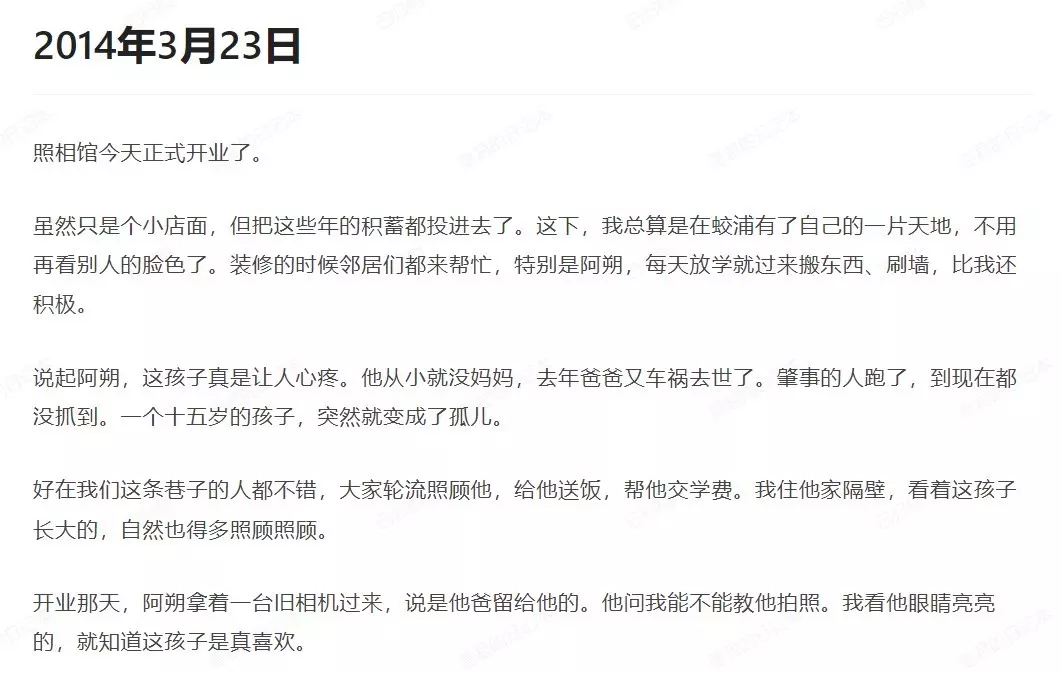 2014年3月23日 薛蔓君的【蔓生活照相馆】开业。 这一年(2014)薛蔓君35岁. 田朔成为孤儿后,街坊邻居轮流照顾他,给他送饭,帮他交学费。 照相馆开业那天,田朔成为店员。