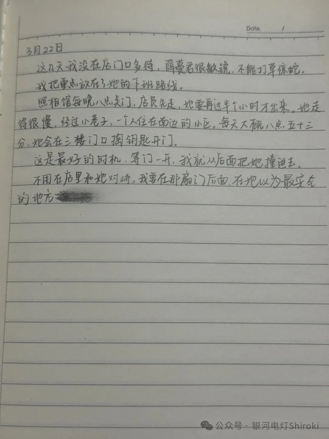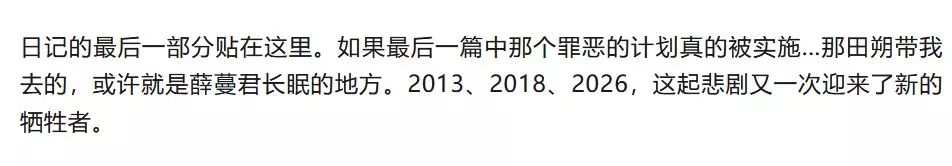 搜索【 20260322 】可获得蔓君的日记本(29) 周小宇在2026年3月22日杀死薛蔓君。 原来"我淘到了一张背影全家福"系列帖子都是田朔写的。他一人同时扮演了"调查者"和"被调查者"。 他要曝光凶手,让周小宇无处可逃。 【 真相】 我是田朔,蔓生活照相馆的员工。 也是"我淘到了一张背影全家福"系列帖子的幕后写手。 是的,也就是说,我一个人同时扮演了"调查者"和"被调查者"。接下来,我将向你们坦白我这么做的原因。 薛姐——薛蔓君,我的老板,被周小宇杀害了。 3月22日晚上8点51分,我接到薛姐的电话。 她的声音非常微弱,像是用尽全身力气在说话:"阿朔……来……快……" 然后就是一阵沉重的喘息声,电话挂断了。 我冲出门往她家跑。我们住得很近,只隔了两条巷子。到达她家的时候,房门虚掩着。我推开门,看到了这辈子都无法忘记的画面。 薛姐倒在客厅地板上,身下是一大片血泊。她的胸口有几道很深的刀伤,眼睛睁着,盯着天花板,已经没有了呼吸。 我像个废人一样,跪倒在她身旁的血泊里。就在这时,我注意到远处的地上散落着一本倒扣的笔记。 我打开它,看到了周小宇的名字。那是周家兄弟的笔记。 2016年11月26日,周家四口来照相馆拍全家福。薛姐发现,他们就是2013年撞死我父亲后逃逸的肇事者。 那天,我和薛姐对他们进行了"审判"——拍下背过身的全家福,用能力让他们每天都清晰地回想起那晚的罪行。 2018年2月8日,周志城、陈宛琴、周宁在去市里的路上出车祸,三个人全部死亡。只有当时没在车上的周小宇活了下来。 去年11月23日,周小宇来到照相馆。 那天,薛姐的能力被"观察者"收回了。周小宇冲进店里质问薛姐的时候,薛姐突然像发疯一样对着空气大喊:"不要拿走!那是我的!" 然后她和周小宇同时倒在地上。 醒来后,两人都失去了相关记忆。当周小宇一脸茫然地走出照相馆时,我没有阻拦他。 薛姐醒来之后,完全不记得自己曾经拥有过那个能力,也不记得我们做过的所有"审判"。她回到了十年前那个普通的照相馆老板的生活。 但我记得。 我记得我们做过的每一件事。我记得那些罪人痛苦的表情。我记得薛姐说过的话:"这是只有我们才能做到的事。" 只有我一个人记得。 我开始怀疑,那些事是不是只是我的幻觉?是不是我疯了,把自己的妄想当成了真实? 更令人没想到的是,失忆的周小宇在无意间翻出了这本笔记,意外找回了记忆。 日记里写得很清楚。3月18日,他看到失忆后的薛姐用"陌生人"的眼神看他,以为她在装,以为她在嘲笑他。 他动了第二次杀心,而这次他成功了。 以上就是我策划这一切的理由。 我在网上装怪谈,发帖编故事;我上传周家的笔记,一人分饰两角录下对话。 我想确认,我和薛姐做过的事是真实的。我想让大家知道,曾经有两个人用自己的方式伸张正义。 同时,我还想请大家记住这个男人的脸。 周小宇,他杀了像妈妈一样照顾我、像师父一样教我惩恶扬善的薛蔓君。我要用我们一贯的方式,对他进行定格记忆的审判。 不过,这次靠的不是超能力,而是你们。 现在你们都知道了。 你们知道我和薛姐曾经做过什么。 你们知道周小宇是凶手。 你们所有人都会永远记得,而他将无处可逃。