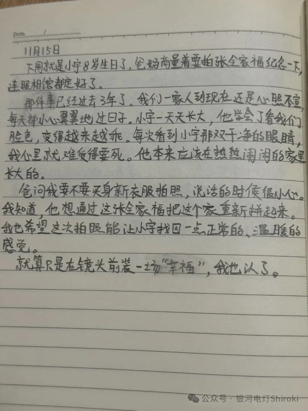 搜索【第一次审判】可获得蔓君的日记本(21) 2016年11月26日: 我从没想过,那个能力会以这样的方式派上用场。 今天下午,前几天预订过一家人来拍全家福。四口人,父母带着两个孩子,看起来很普通。 到了化妆环节,化好妆的夫妻坐在我们后面闲聊。然而聊过几句后,丈夫突然像想起什么似的,低下头轻声说:“都已经过去三年了啊。我开车的时候,还偶尔会……”我从化妆镜中看到他有些恍惚,声音也越来越轻,直到完全听不见。 妻子赶忙用手肘撞了他,他才缓过神,悄悄瞥向我们。 顺着他的视线,我看到了阿朔放慢了手上的动作,有点出神。他一定和我想到了同一件事。 三年前的11月,阿朔的父亲像往常一样去市里做工,但阿朔在家里等了一整晚,也没能等到爸爸回来。第二天一早,他父亲的遗体就在连通市里与蛟浦镇公路的坡下被找到,身旁还躺着一辆老旧的电动车。 警方鉴定这是场车祸,肇事车辆逃逸。但那晚下了暴雨,那个路段既没路灯也没监控。三年过去了,这件事一直是阿朔和我心里的疙瘩。 而这对夫妻的举动,让我重新看到了希望。在我看过的那些圣经故事中,惩治坏人的永远都是上天、都是神,而现如今,一种可以看破罪恶的“神力”就握在我的手上。我感受着开始狂跳的心脏,第一次发动了能力。 我手里的粉扑掉在地上。 就是他们,那是一场发生在暴雨夜的,因两个孩子抢手机而引发的意外。 但令我愤怒的是,他们明明没有恶意,却还是在瞬时的判断下选择了逃逸,甚至隐藏到了今天。 他们将要拍下这套全家福的前几天,是阿朔父亲的忌日,是他们家庭的破裂日。 我深吸一口气,强迫自己平静下来。 化妆结束后,我把阿朔拉进暗室,把所有事都告诉了他——能力的事,刚才听到的事,还有我在那个父亲脑海里看到的一切。 阿朔的脸色一点点变白。他靠在墙上,浑身发抖。 过了很久,他才说:“薛姐,我们该怎么办?” 我下定决心,向他提出了我的建议。 我淘到了一张背影全家福(2) 日记(2月6日) 可以看到数字【20180208】