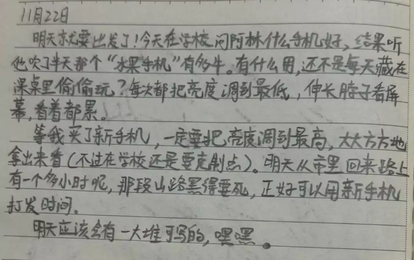 2013年11月19日,周父决定周末带孩子去市里玩。 2013年11月20日,周宁上体育课抢篮板的时候把脚崴了。 2013年11月21日,周父对周宁说,要在去市里那天给他 买手机 (球鞋就先不买了)。 (关键因素:手机) 2013年11月22日,根据日记信息可得知,从市里回来会经过一段山路,山路 很黑 (容易发生事故)。