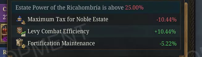 是的,这段描述文本已经不再适用了。 其他陆战相关修复: 1. 修复了存档/读档后堡垒防御修正值立即计算错误的问题。此前,堡垒会错误地失去防御加成,直到下一个月度结算时才恢复,这使得刚加载的存档在短期内更容易被围攻。 2. 在敌方领土被削减至零兵力的军队不再无限期地以幽灵部队形式存在:它们现在每天都会尝试溃退,如果没有有效的撤退地点,该军队将被自动摧毁。 3. 被困在冬季无法通行地形中的军队在等待季节变化期间不再消耗士气。海战 长期以来,海战一直受困于令人沮丧的小规模战斗循环:即使是数量远远落后的舰队,也能无限循环——承受少量攻击后撤退到最近的海域,然后在追击舰队抵达时立即重新交战。我们已做出三项改动来打破这一模式。 1. 海军战斗现在双方均可脱离战斗前的最短持续时间从1天延长至3天,这让舰队在溜走前,舷炮有足够时间造成实质性伤害。 2. 我们提高了导致撤退舰队溃散回友方港口而非仅退至相邻海域的士气阈值;遭受重创的舰队现在将直接逃回母港进行修理,而非在相邻海域徘徊。第三,AI海军将领此前没有主动从劣势战斗中撤退的逻辑,他们只会承受攻击直到最后一艘船沉没。现在他们会在战斗中评估实力差距,当明显处于劣势时会下达撤退命令。 这些改动共同意味着,追击敌方舰队的过程将更具决定性:被围困的海军会战斗数日,遭受实际损失,而当它最终溃败时,会逃到足够远的地方,让你有时间在下次交战前重新集结。 海军舰船在冬季入港时不再遭受损耗,终结了船只安全停泊却仍因寒冷损失水手的恼人情况。《欧陆风云5》更新内容 1. **海军补给建筑的建造不再需要铜和锡**,因为这些需求曾是瓶颈,导致早期海军过度依赖特定贸易路线。现新增布料作为新的输入材料,以在避免瓶颈的同时维持有意义的维护成本。 2. **AI方面进行了多项修复**:运输舰队现在会等军队完全登船后才起航;舰队不再将自身定位在距离所补给军队过远的位置;后勤目标系统不再试图从无粮可收的省份收集食物。《欧陆风云5》其他次要改动 1. 强大的贵族阶层现在提供征召兵作战效率加成,而非反间谍加成 此前,强大的贵族阶层会为统治者提供更好的反间谍能力,这是一种微妙且几乎难以察觉的增益,大多数玩家从未注意到。我们对此进行了调整,现在强大的贵族阶层将提升征召兵的作战效能,在满意度达到满值时可提供最高30%的征召兵作战效率加成。此举旨在让贵族权力与军事力量之间的关系更加直观且易于理解:一个感受到尊重并治理得当的强大贵族阶层,将激励并带领你的农民士兵更奋勇地作战。这在主题上也更契合,贵族作为军事阶层,他们的忠诚理应体现在战场上,而非阴影之中。