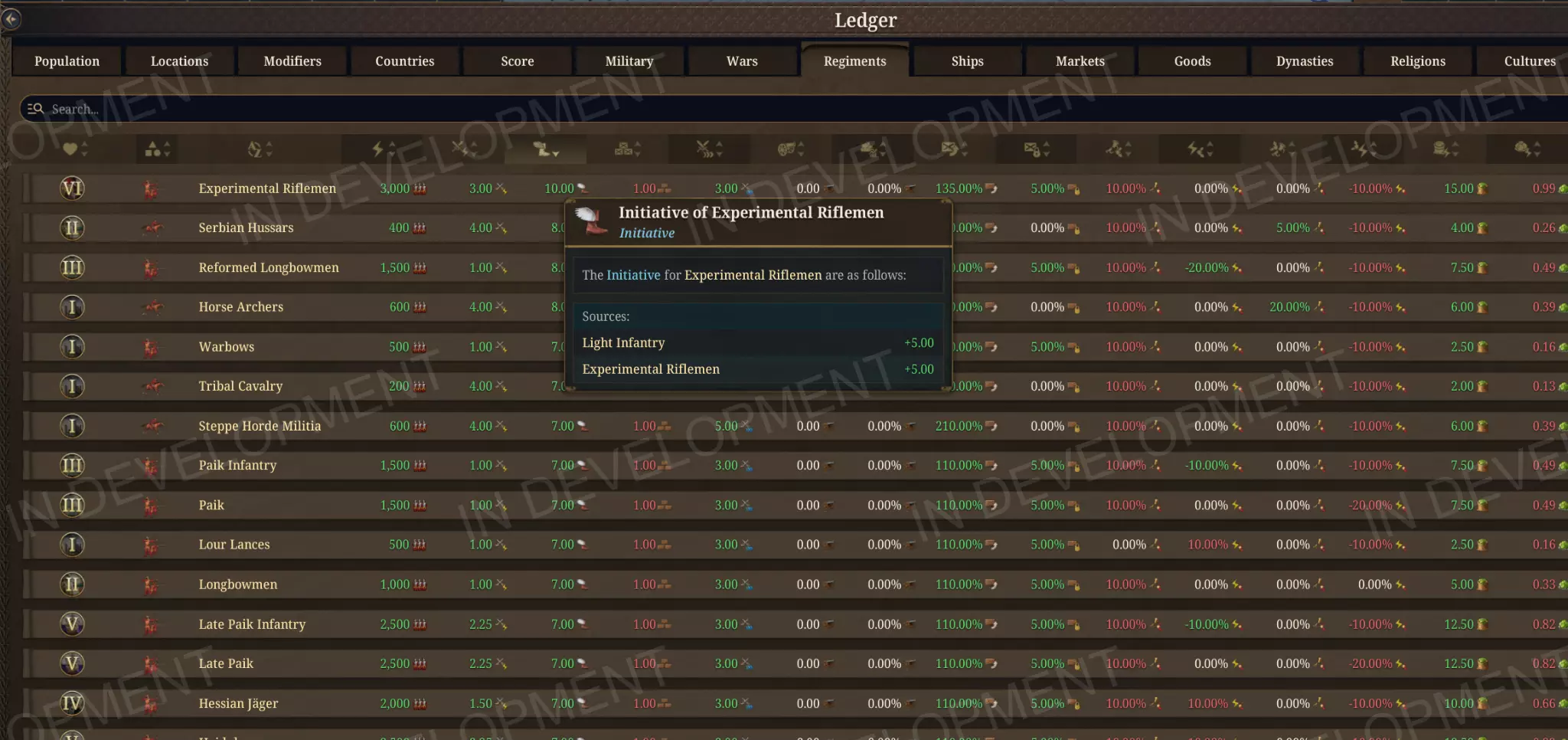 当然瑞典重步兵才是最棒的。 新的军事账簿页面 账簿在军事方面得到了显著扩展。除了现有的国家概况外,现在还有专门的 regiment( regiment)和舰船页面。regiment 页面允许你比较不同单位类型的统计数据,这样你就能一目了然地看到你的部队在兵力、士气和纪律方面的情况。舰船页面对于海军的作用类似,将船员规模作为战斗能力的主要衡量标准。战争页面会显示当前的冲突,并提供可排序的列,包括战争分数、参与者和持续时间。