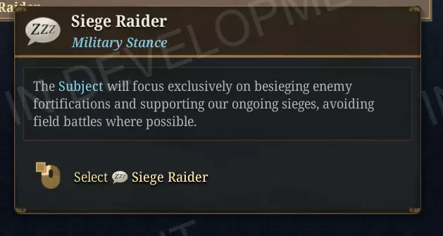 如果他们拥有金属武器,是否能奏响激昂战歌? 围城突袭军事姿态 新的围城突袭附庸军事姿态会指挥你的附庸军队专注于摧毁敌人的防御工事网络,而非参与可能战败的正面会战。 当附庸被设为围城突袭姿态时,他们会全力优先围攻敌方地点,主动加入任何已进行的友军围城,并且在敌人反击时仍能坚守自身领土,但不会深入敌境追击敌方野战军。与兼具高围城活跃度和高寻战倾向的【进攻姿态】不同,【围城突袭者姿态】会让你的附庸避开不必要的交战:他们的军队在前往下一个围城目标的途中会绕开敌军,而非停下战斗。 如果你的附庸陷入一场非主动选择的战斗,他们会比在其他姿态下更快撤退,因为在野外战斗中消耗附庸军队正是你让他们要避免的情况。 这种姿态与你自己的野战军配合时效果尤为显著:你牵制或消灭敌军,而附庸则在后方拔除堡垒,在不使你花钱征召的军队陷入风险的情况下加速战争分数获取。
