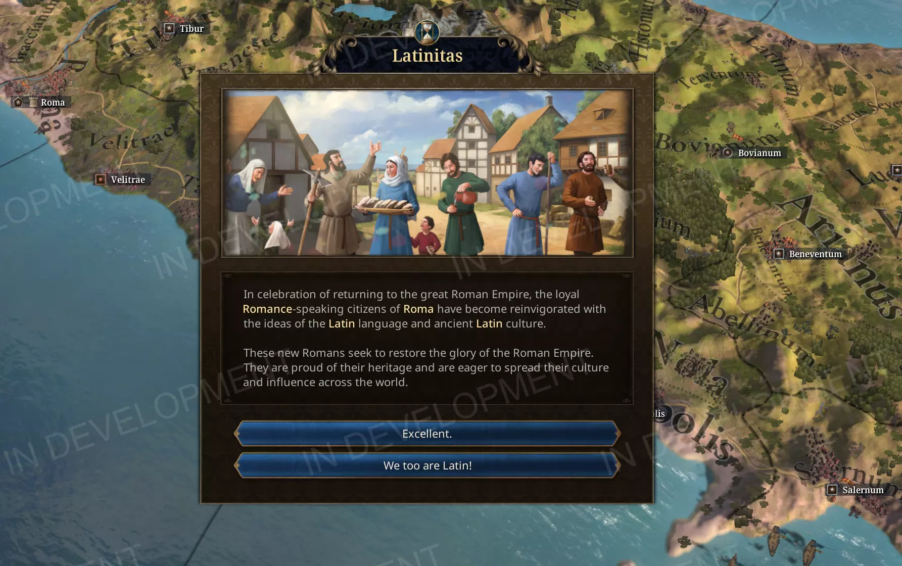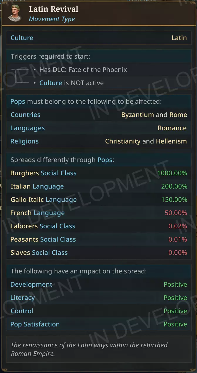 我们还新增了【拉丁化运动】,当拜占庭控制大量高满意度的意大利城市时会触发此事件,该运动代表着高满意度的罗曼语族居民愿意以罗马人身份重新加入罗马帝国的整合过程。