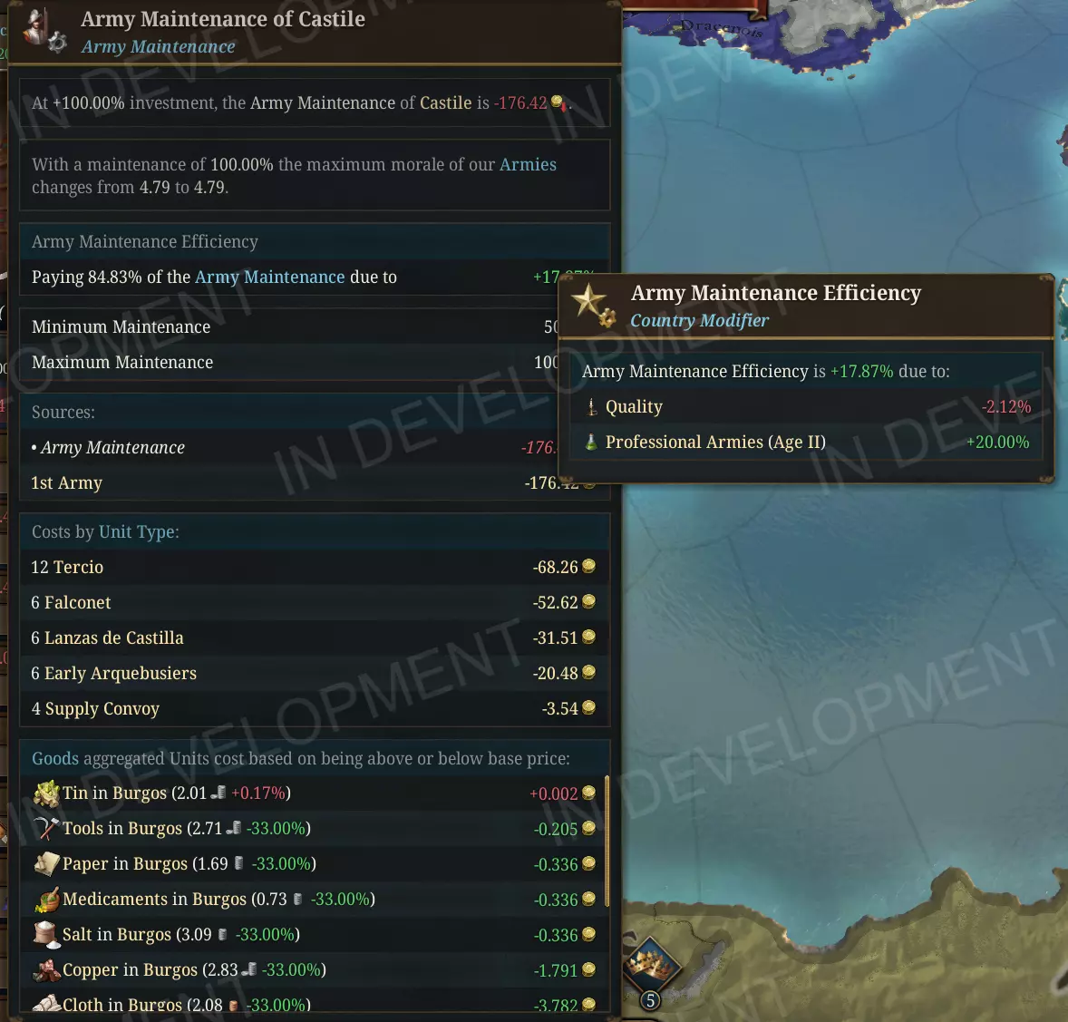 贵族掌权!断头台什么的,等我们组建起正规军再说! 征兵方式提供的兵力越少,消耗的人力也越少。 玩家在选择征兵方式时,可以选择加急训练。此前,加急训练会降低部队的初始兵力,但消耗的人力却与常规训练的兵团相同。这就造成了一种奇怪的情况:你可能会以同样快的速度耗尽人力池,却只能得到战斗力更弱的部队。现在,我们已将人力成本与兵力惩罚直接挂钩:如果某种征兵方式招募的部队兵力仅为正常水平的25%,那么其消耗的人力也为正常水平的25%。这使得紧急征兵成为一种真正的权衡选择,当人力充足时,你可以征召更多但质量较低的部队,而不是将其视为纯粹的次等选项。 维护费用现在采用效率修正值 所有陆军、海军和雇佣兵的维护修正值已从成本降低值转换为效率值。实际差异体现在机制和表现两方面:旧有的“army_maintenance_cost = -0.10”设定容易让人混淆,因为你必须记住负值代表有利效果,而且多种来源的修正值会线性叠加,可能导致维护费用低到不合理的程度。新的设定为“army_maintenance_efficiency = 0”。20惯例采用倒数公式,将基础成本除以(1+效率),这会在高数值时产生自然的边际收益递减,并使用一致的“正值即优”符号。为此,需要更新超过70个脚本文件,涉及科技、法律、阶层特权、政府改革和建筑等内容,同时重新计算等效数值以保持原有的游戏玩法影响。